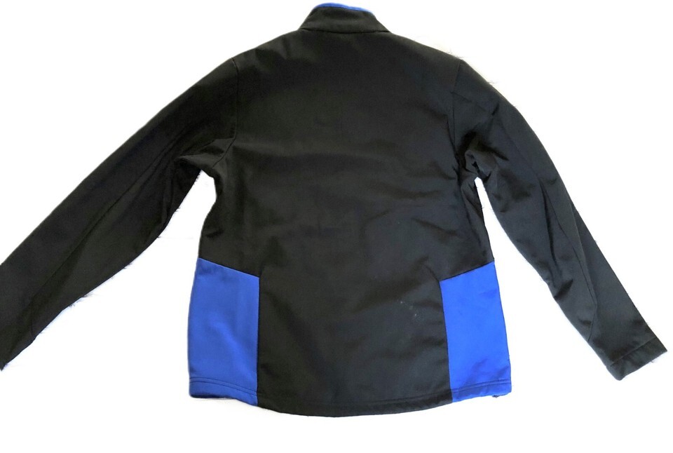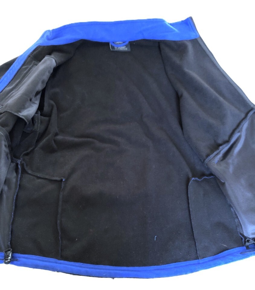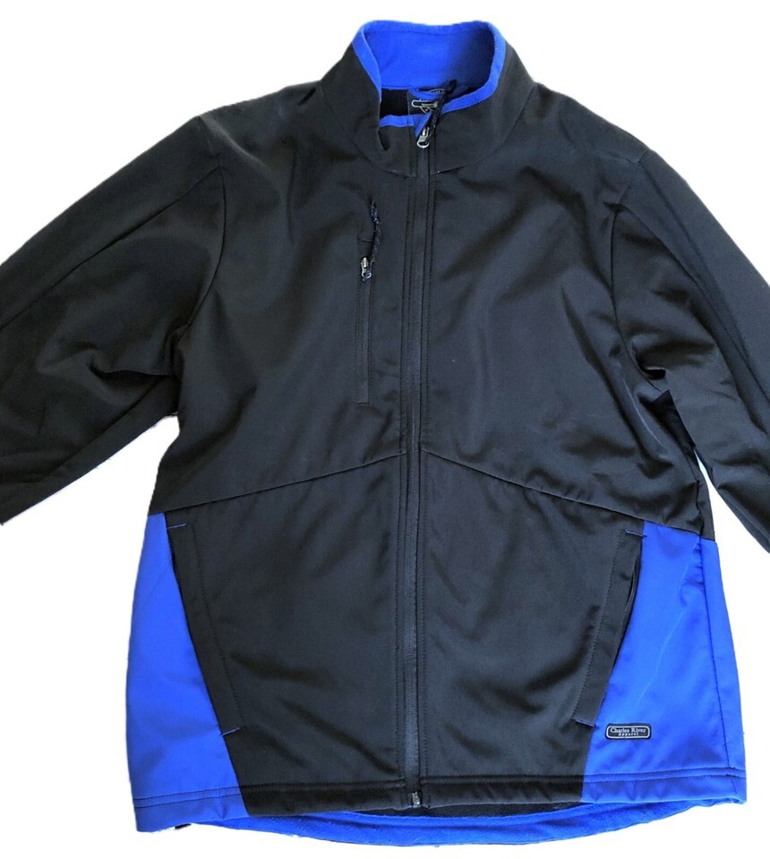 Men's Black Blue Jacket Charles River Apparel Medium. Made with polyester and spandex. The jacket has three zippered pockets in front. The exterior of the coat has a harder spandex fabric. The coat is still in good, clean, pre-owned condition. Combined shipping is added in cart when you purchase multiple items at my shop.