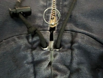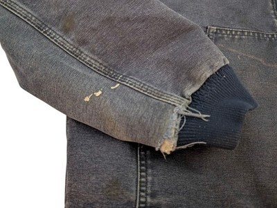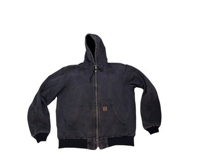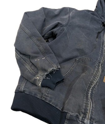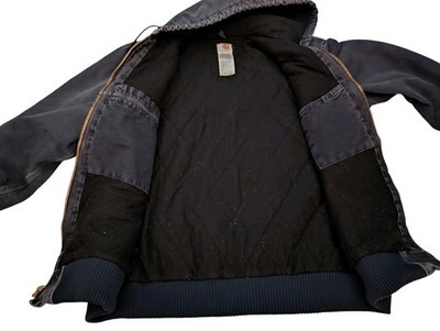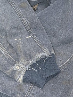 This is a men's navy blue Carhartt insulated hooded jacket size large tall. 100% cotton shell. This coat is in rough condition. Please see the close up pics. Right sleeve cuff is ripping. Left sleeve cuff Is afraid. Color is fading. The zipper pull has broken off so a makeshift pull has been put on. Please see close up pictures. The zipper itself works fine. Although the very bottom part of the zipper has come detached from the coat. But it works totally fine. The zipper zips up. Please message me if you want more pictures or info