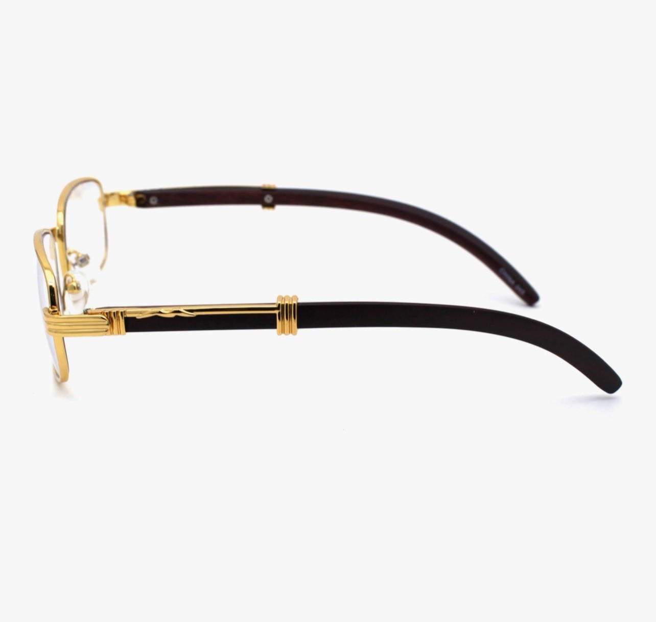 Step up your style with these Contemporary Clear Lens Eyeglasses?designed for the modern man who values both minimalism and detail. The slim gold frame adds a refined edge, while the wooden-effect arms bring a natural, earthy contrast that feels timeless and elevated.
