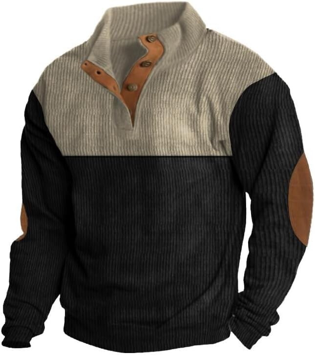Mens Corduroy Sweatshirts Casual Lapel Collar Mock Neck Button Pullover Sweater, Apricot-Black, L