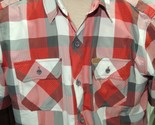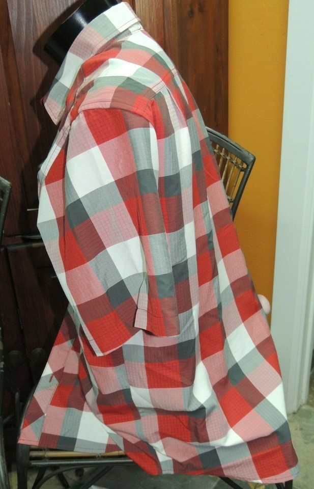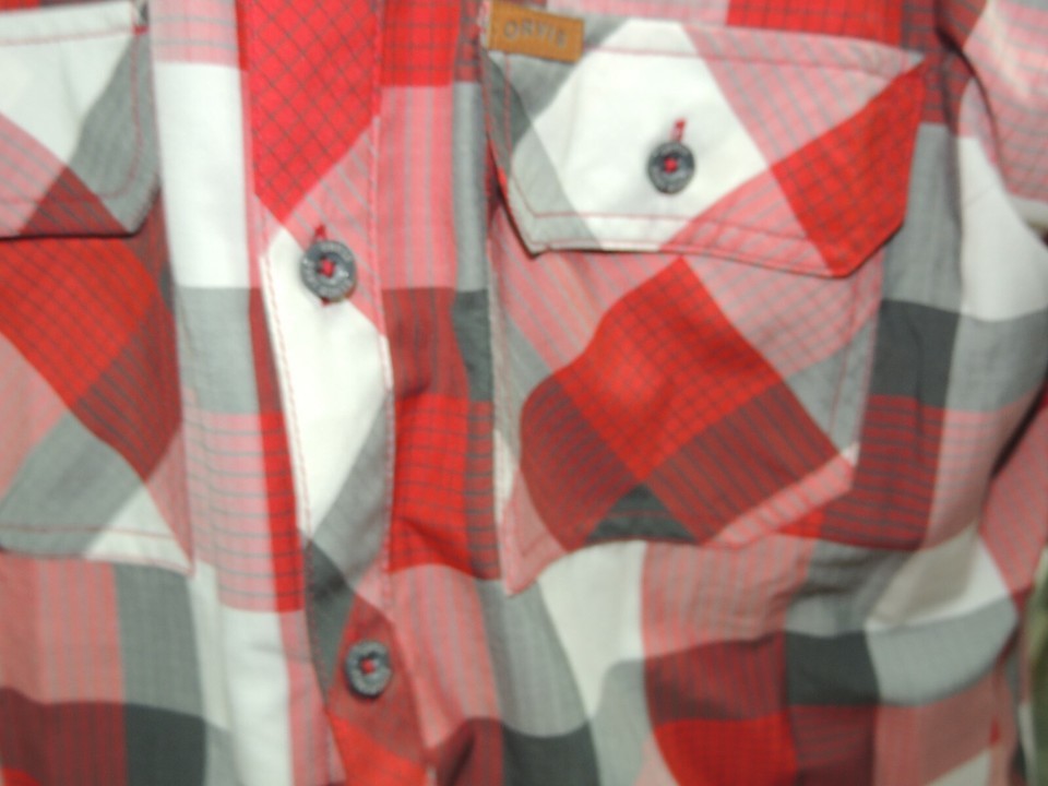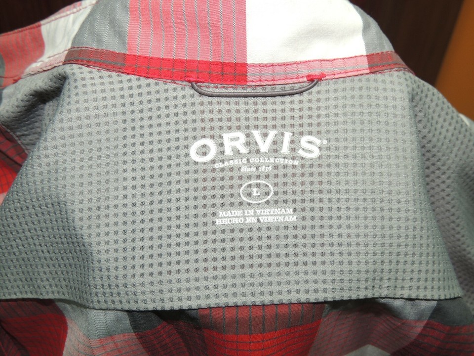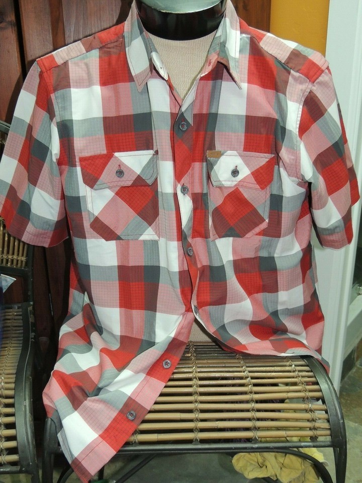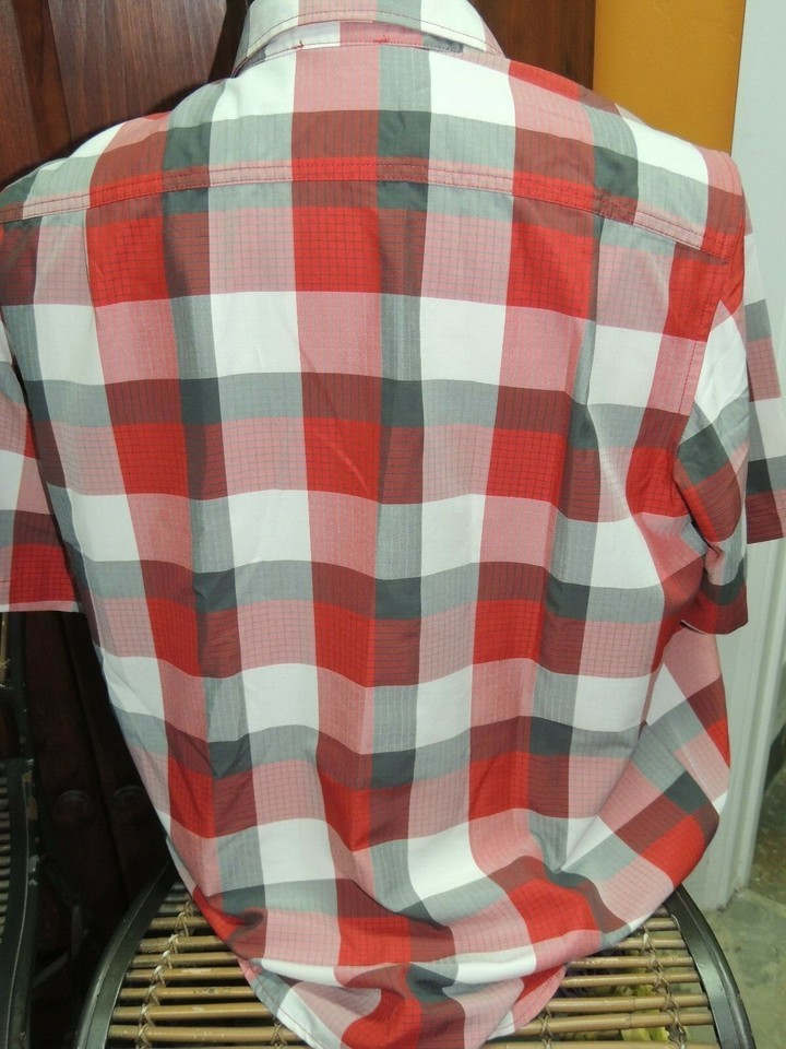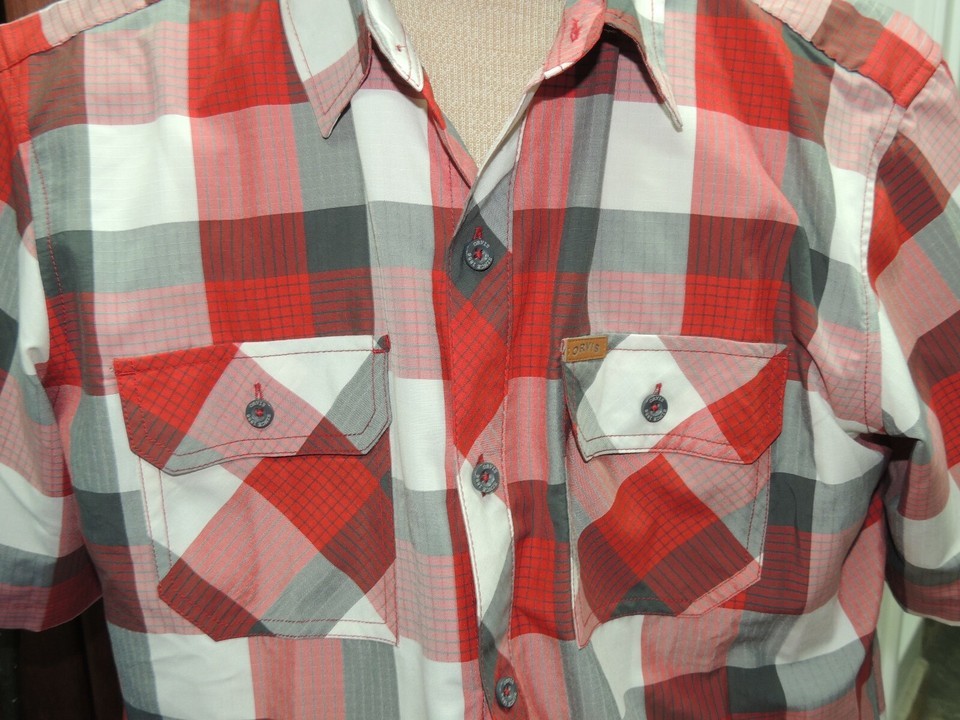 - Men's LARGE Orvis Short Sleeve Shirt Red & White PLAID poly tech lightweight