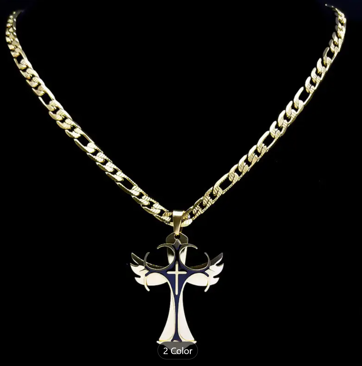 This Men's Stainless Steel Cross Necklace Bracelet Set is a stylish and meaningful piece of jewelry. The pendant shape is a cross, making it a religious and symbolic accessory. The necklace and bracelet are made of high-quality stainless steel, giving them a sleek and durable finish. The design features silver and black accents on the stainless steel, adding a touch of elegance to the set. This set is perfect for those looking for a fashionable and religious piece of jewelry to add to their collection.