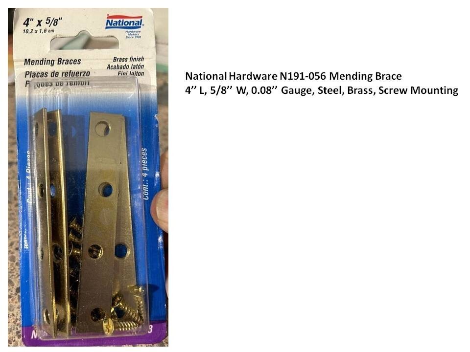 National Hardware Mending Brace, Material Gauge: 0.08 in, Steel, Brass, 4 in L, 5/8 in W, Screw Mounting, Number of Mounting Holes: 4, Mounting Hole Diameter: 0.33 in, Includes: Screws