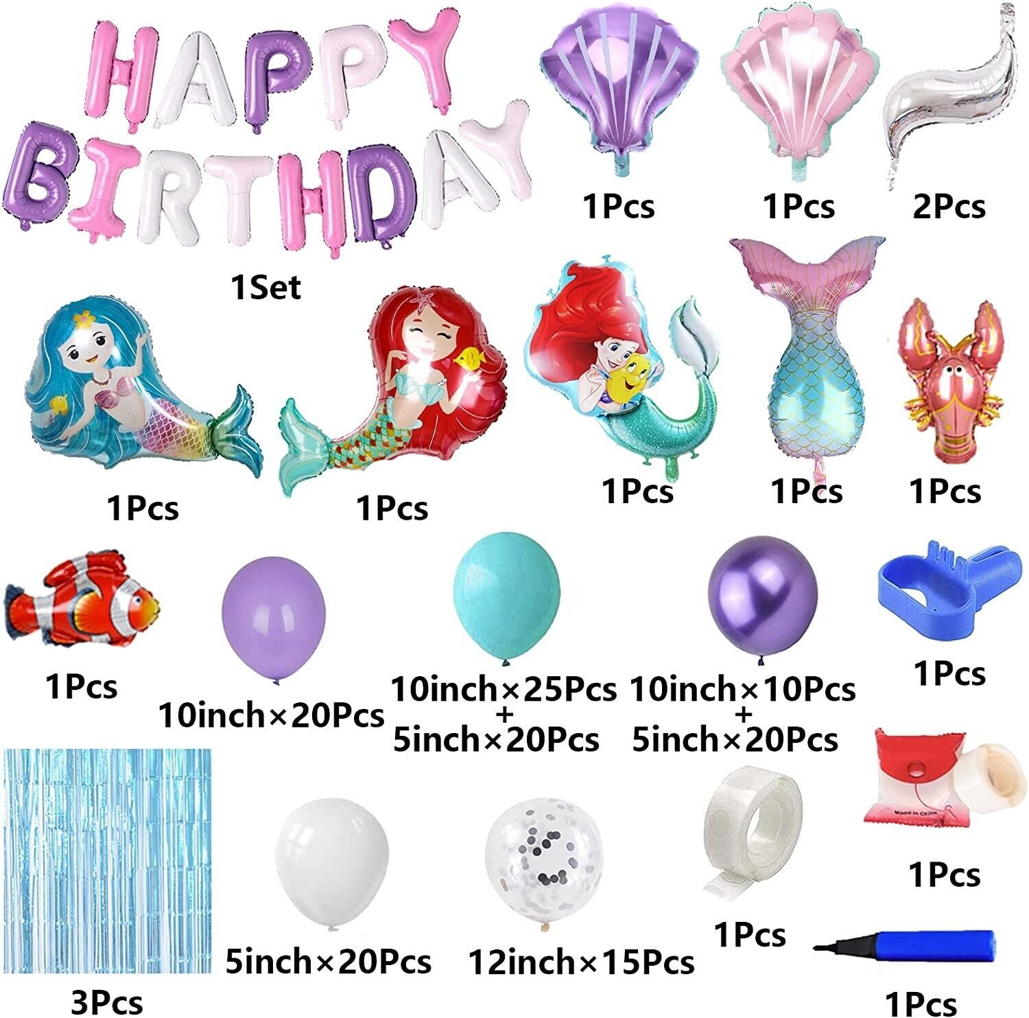 ? Mermaid theme package:Mermaid Princess balloon 3pcs,Mermaid tail balloon 1pcs,Shell balloon 2pcs (pink and purple),Small fish balloon 1 PCs,Lobster balloon 1pcs,130pcs wedding garland Balloon Kit (including 7 balloons of different colors or sizes, please refer to the product details for details),Blue Foil Curtains 3PCS, 4-piece operation Kit (quick binding balloon bracelet, balloon chain, inflation pump, double-sided adhesive tape),All 145pcs