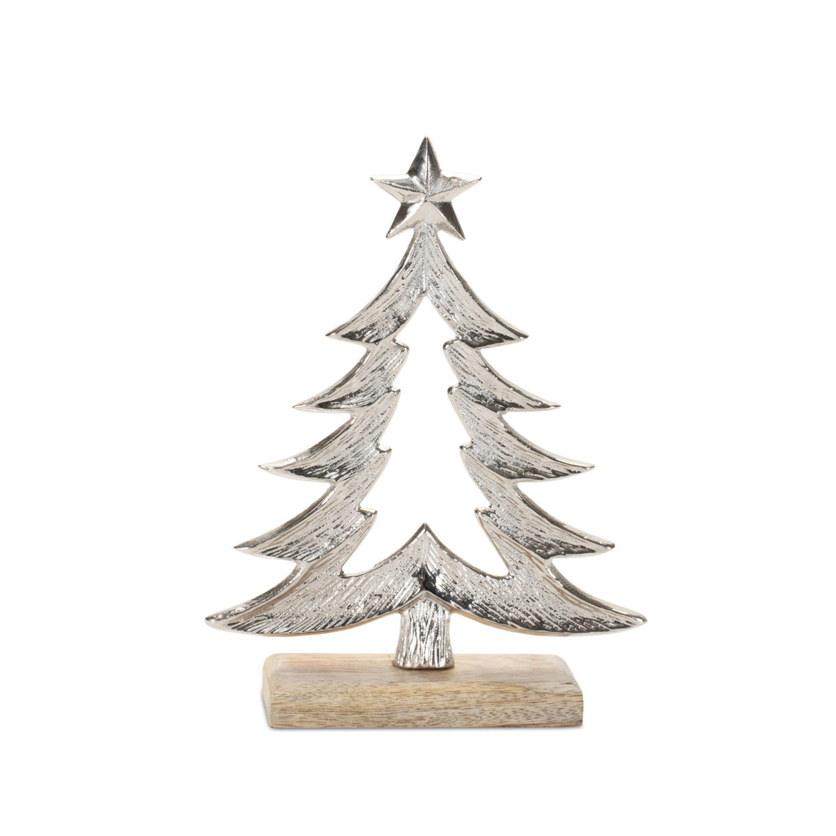 Chic Modern Design Silver metallic finish paired with rustic natural wood base accent gives a contemporary yet festive look. Versatile Size Options Includes two assorted sizes for a dynamic display on mantles, shelves, or tabletops. Perfect for Holiday Decor Ideal for pairing with seasonal decor like holiday floral arrangements, Santa figurines, or deer accents for a charming holiday display. Suitable for indoor use only