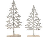 Modern Rustic Design Sleek silver metallic finish on the trees, contrasted with a natural wood grain base, creates a perfect blend of chic and rustic holiday style. Versatile Display The two assorted sizes allow for creative placement on tables, mantles, or shelves, enhancing any holiday setting. Stylish Holiday Touch Ideal for pairing with other seasonal decor such as floral arrangements, holiday deer, or Santa figurines for a festive look. Suitable for indoor use only