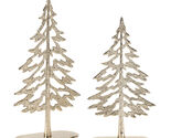 Elevate your holiday decor with this Metal Tree with Wood Base Set. Featuring chic gold tones and a stunning metallic finish, these trees boast traditional pine tree shapes, perfectly complemented by a rustic natural wood grain base. The set includes two trees of varying heights, making them ideal for a stylish and dynamic display on your tabletop, shelf, or mantle. Pair them with a seasonal floral arrangement or holiday figurines for a polished, festive look that will shine throughout the season.