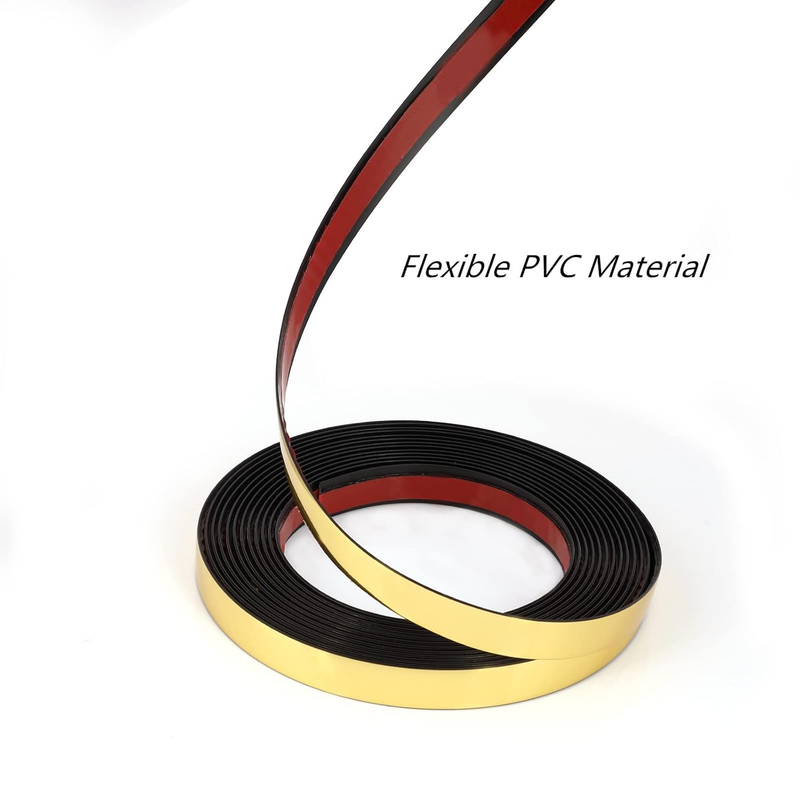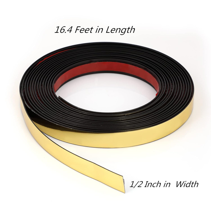 ?Flexible Metallic Gold Decoration Tape?Our metallic molding trim tape is made with gold flexible PVC material with glossy, shiny vibrant mirror-like finish surface, and strong adhesive tape on the back. Each roll measures 16.4 feet in length, 1/2 inch in width, 0.04 inch in thickness.