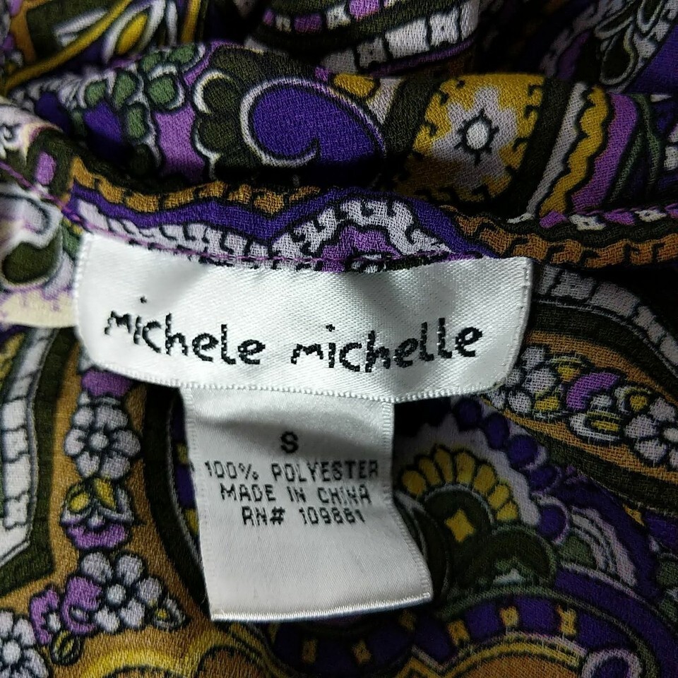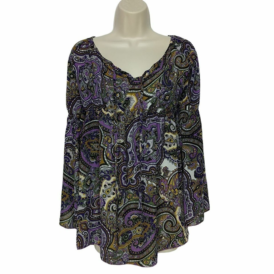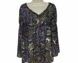 - Michele Michelle Boho Blouse Top Size Small Purple White Green Paisley Sheer