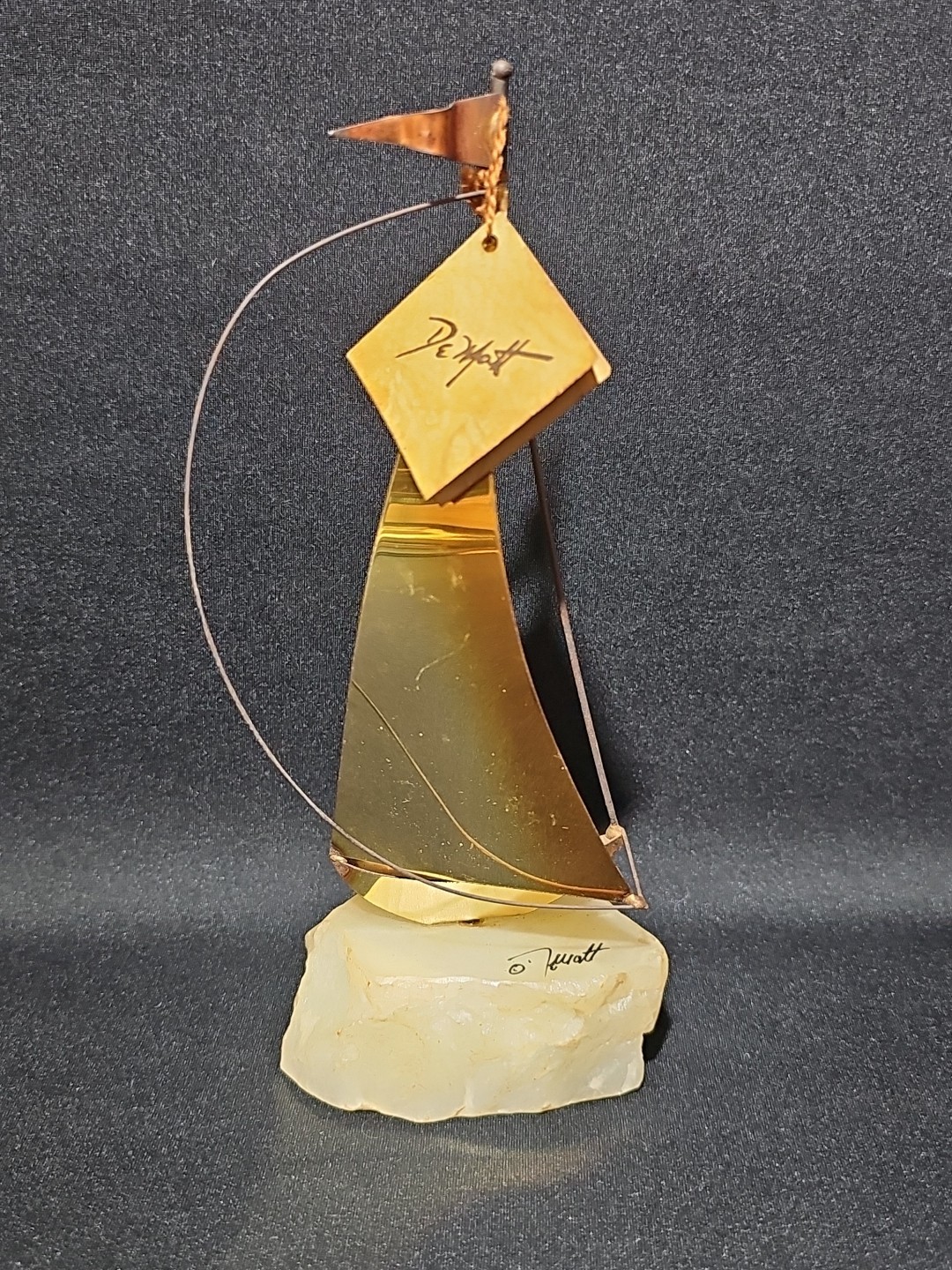 UP FOR SALE: This design is from the collection of sculpture crafted by California artists John and Don De Mott. Each design is delicately hand fashioned under the supervision of the artists. It is made of fine quality brass, copper, and steel and is mounted on imported onyx. A lacquer coating protects the sculpture from tarnish.
