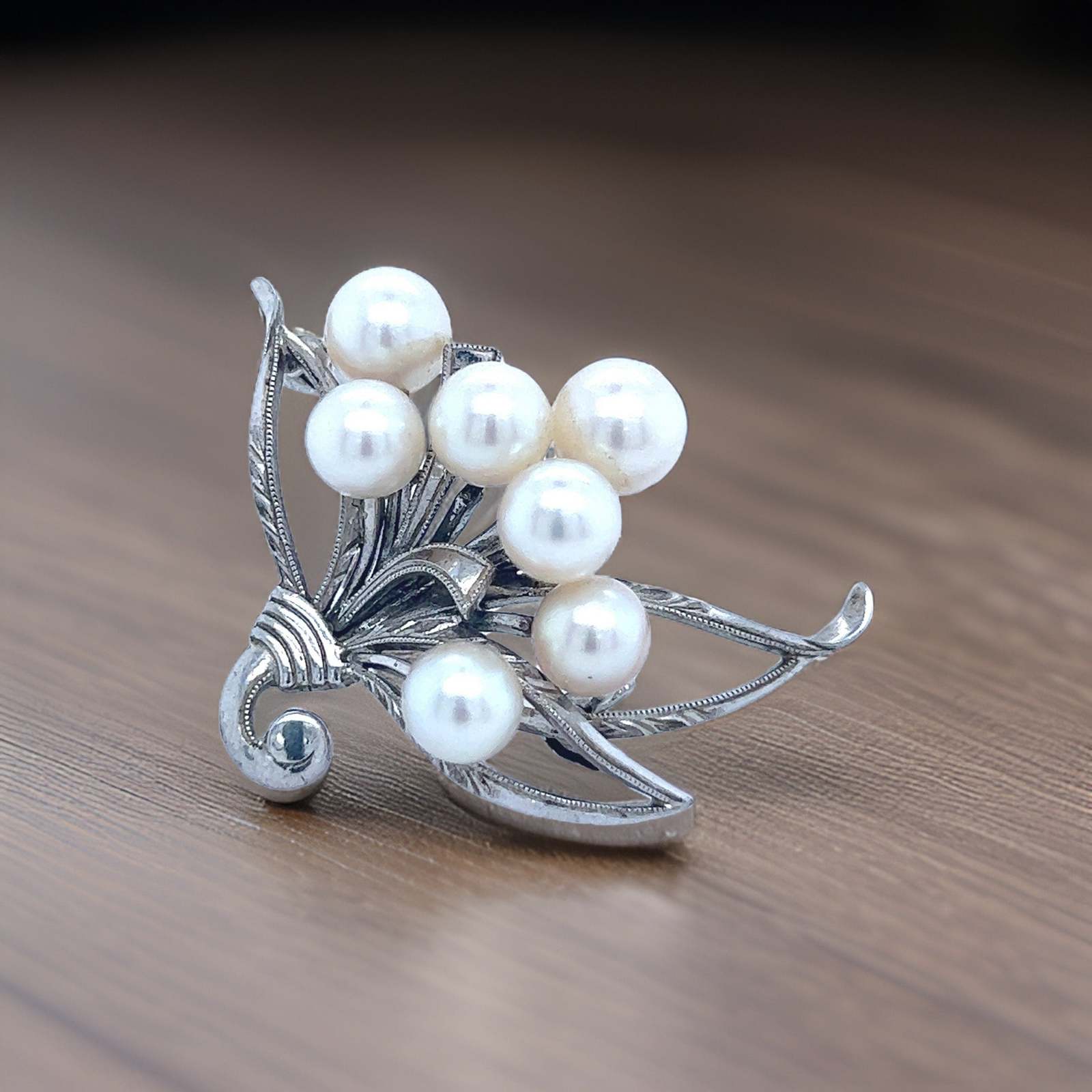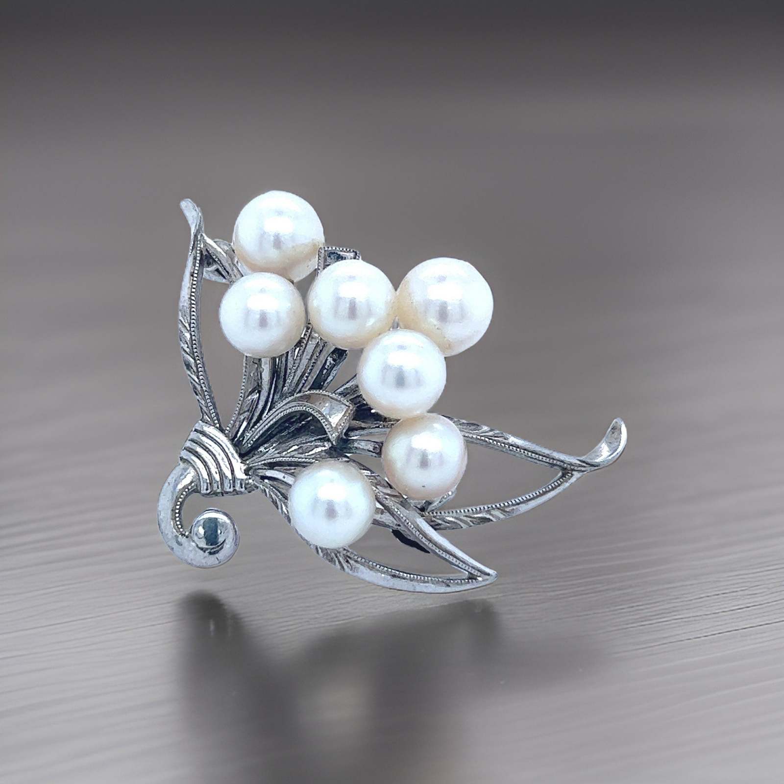 This elegant Authentic Mikimoto Estate sterling silver brooch has 7 Saltwater Akoya Cultured Pearls 6.74 mm and has a weight of 6.67 Grams.