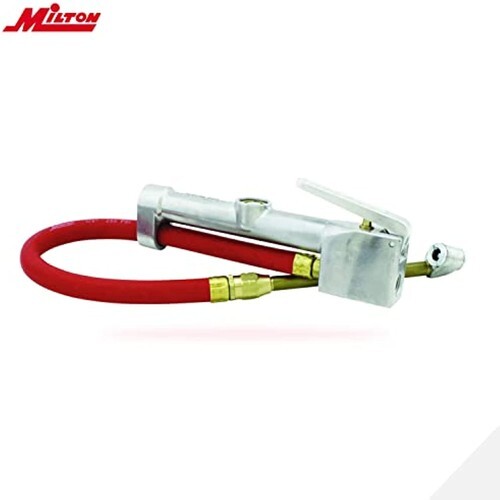 Milton (#506) Original Dual Head Chuck Tire Inflator Gauge - 15" Hose Milton Industries specializes in tire inflator gauges and this original S-506 dual chuck inflator gauge was the first gauge of its kind ever built in the industry. We were also the very first in the industry to offer replacement cartridges! Gauge and valve cartridges are both replaceable. This essential pneumatic tool is ideal for any vehicle trunk, home garage, or automotive shop. Dual head chuck inflator gauge is made of heavy duty construction which provides for long life, even under extreme use and conditions. Equipped with magnifying lens for full view of scale. 1/4" NPT air inlet. USES: Auto, sport utility, truck, bicycle, motorsport, trailers, motor homes/5th wheels, wheelbarrows, golf carts, lawn tractors, motorcycles, ATVs, and more. PRODUCT SPECIFICATIONS: PSI: 10-160Increments: 2 lb.* kPa: 80-840 (available via special order)Increments: 20 kPaThreads: ?-241/4" NPT air inlet INSTRUCTIONS FOR USE:If using a dual head type tire chuck with an inflator gauge and notice air is escaping through the off-side once connected to the tire?s Schrader valve, simply release the trigger and remove the inflator from the Schrader/tire valve. Point the straight side of the outlet up into the air (make sure it?s not pointed at someone). Squeeze trigger, allow air to flow (gravity will cause the sealing valve to drop), and place the chuck end onto the Schrader/tire valve while air is still flowing. Air will start to flow into the tire.Dual head type tire chucks are unable to inflate a completely flat (zero air pressure) tire. Tire air pressure would normally cause the sealing valve to move and seal the unused side of the chuck. However, if a tire has 0 air pressure, the self-sealing valve has no pressure to react to. DRIVE SAFELY: Maintaining proper tire pressures improves vehicle handling, reduces risk of tire failure, improves fuel economy, and increases the life of your tires.