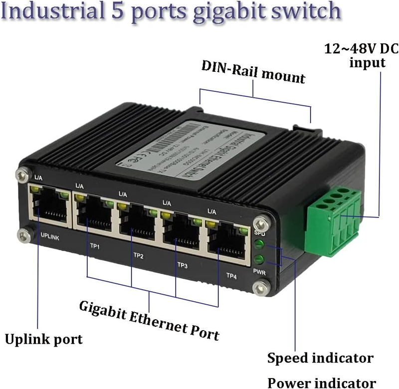 10/100/1000Mbps Ethernet ? The Industrial 5 ports Ethernet Switch have 5 RJ45 ports 10/100/1000Mbps half/full duplex.
