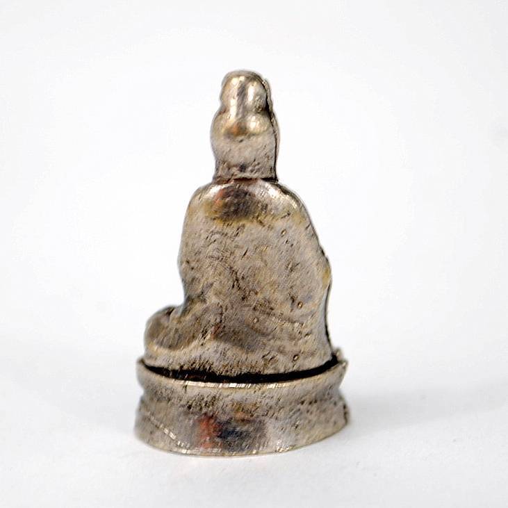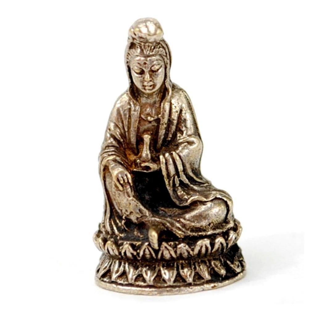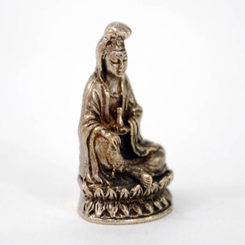 This mini white bronze statue is a respectful representation of Kwan Yin, the Buddhist goddess of compassion and mercy. It is expertly crafted with amazing detail for its tiny size.