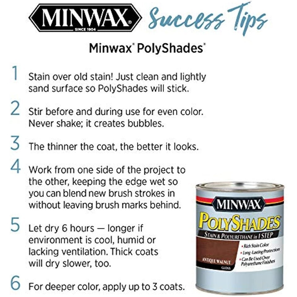 It?s easy to apply Minwax PolyShades with a high quality natural bristle brush. There?s no stripping or heavy sanding necessary to remove the old finish. Simply give it a light sanding with a fine-grit sandpaper, remove sanding dust, and brush on a coat of PolyShades.