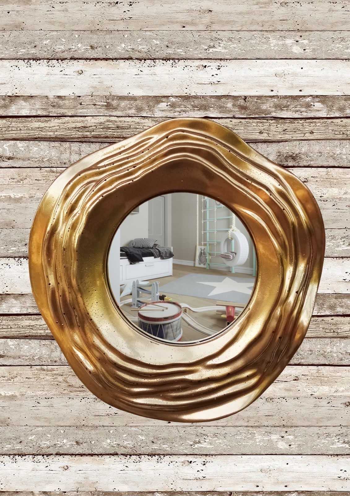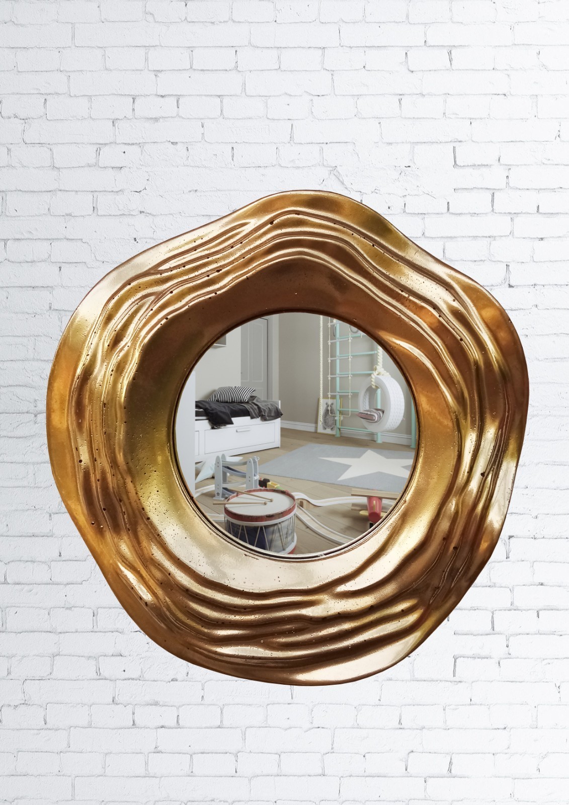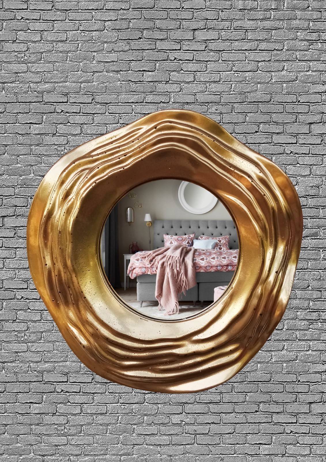 resin. Round, handmade designer mirror on the wall. It is a beautiful