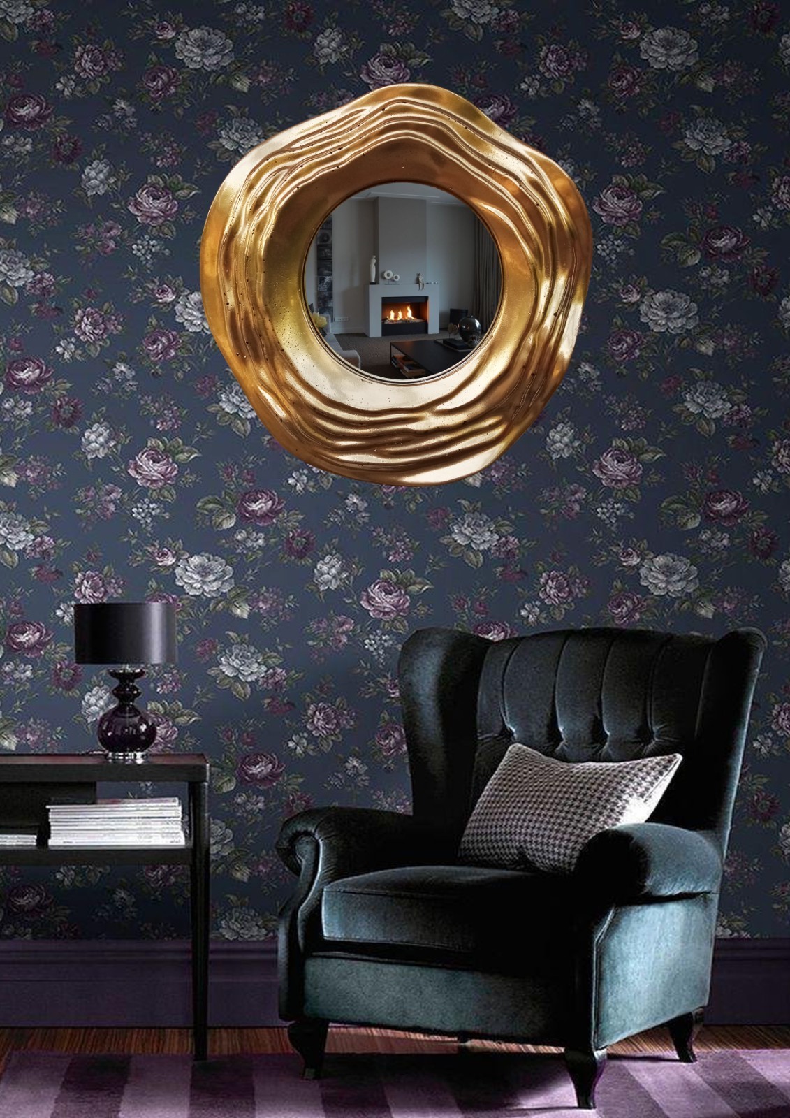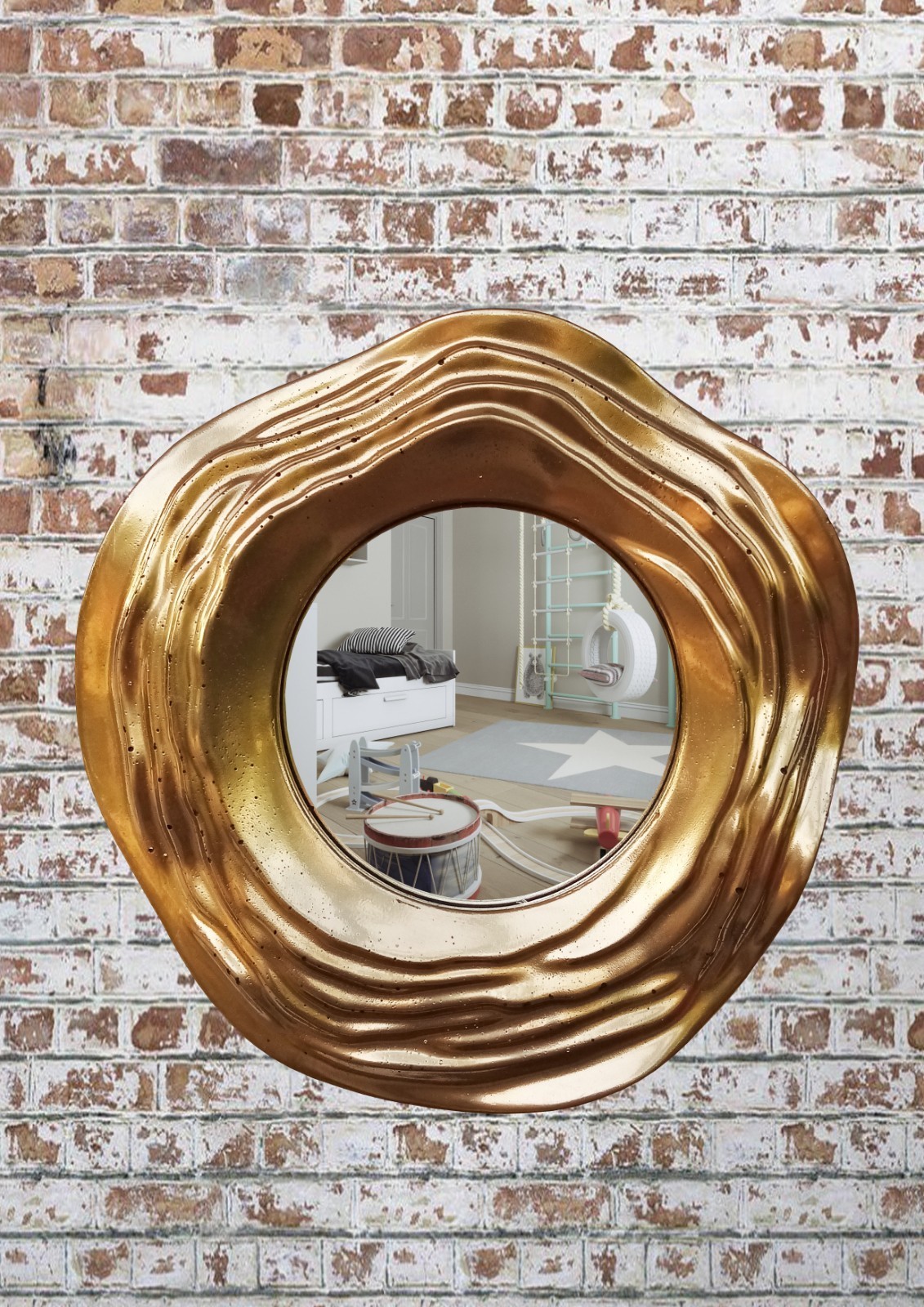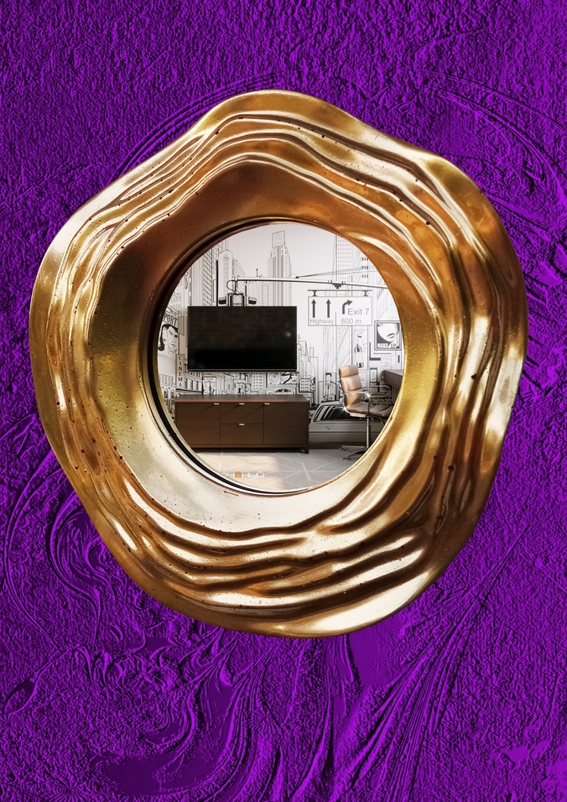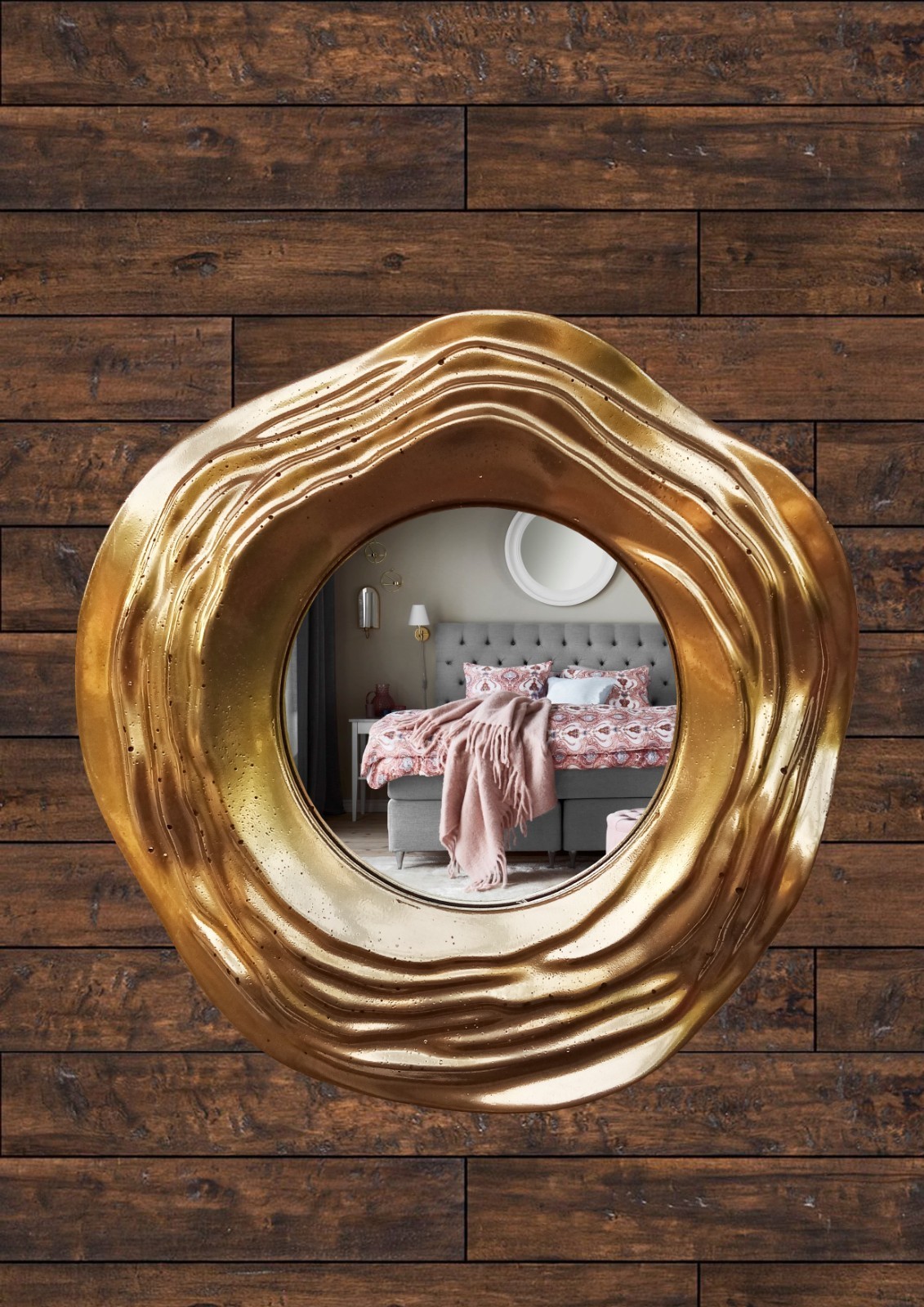 resin. Round, handmade designer mirror on the wall. It is a beautiful