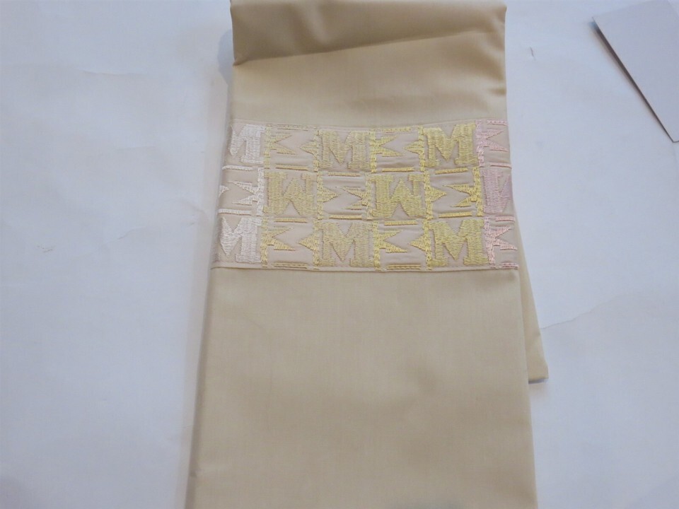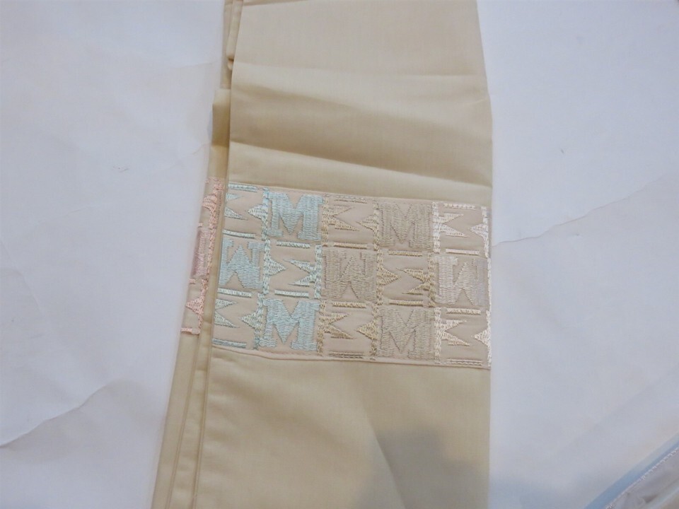 embroidered Missoni logoM's in different colors of gold, pink, dark pink and blue green on flat and pillowcases cuff