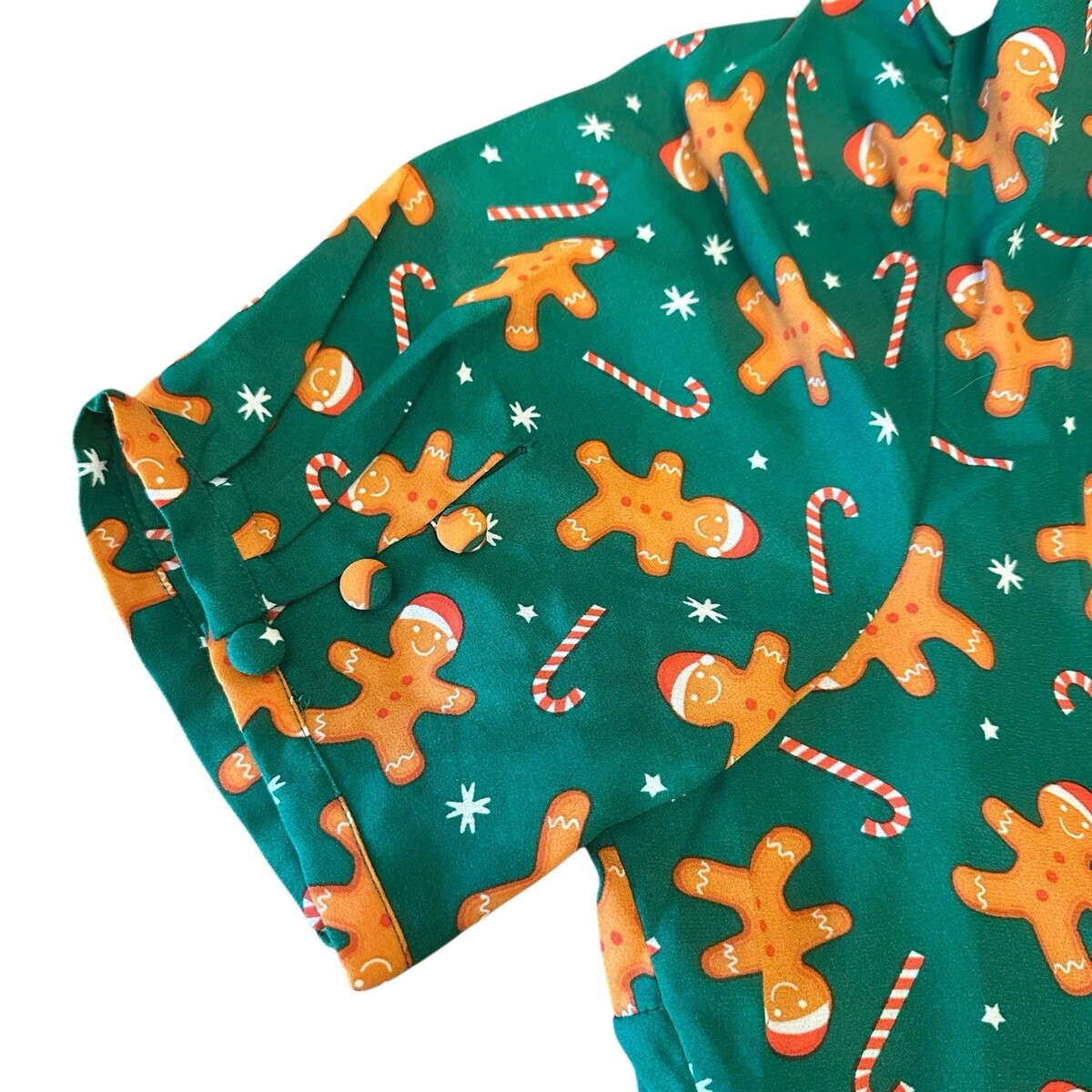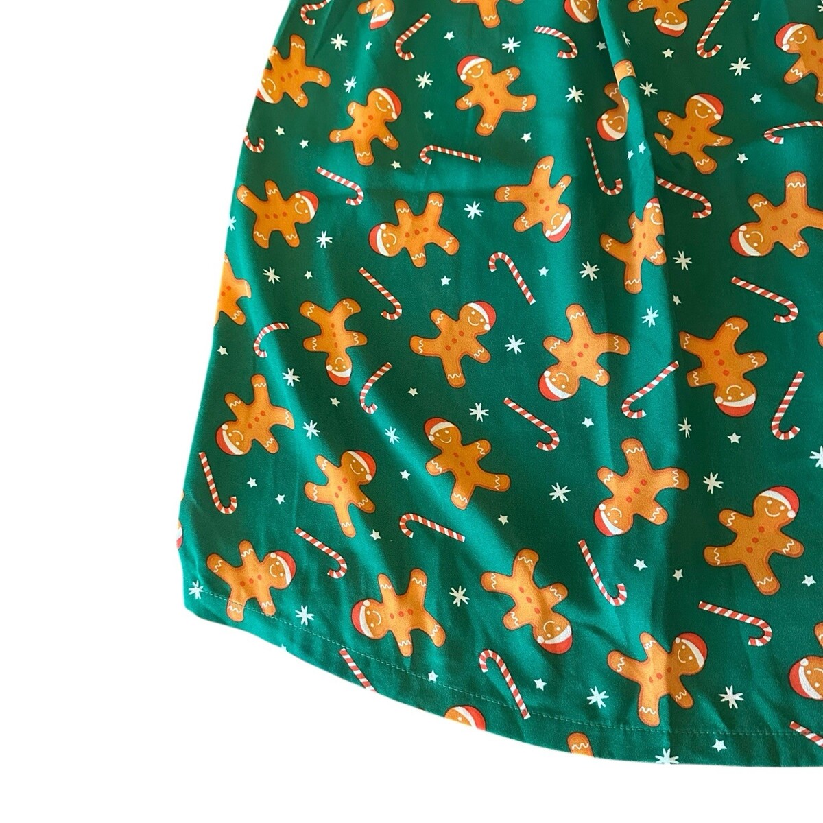Let this whimsically festive, green dress from ModCloth be the happy thought that makes your holiday spirits soar! Made from a lightweight woven fabric and boasting an exclusive hand-drawn print of gingerbread cookies playfully tumbling amidst candy canes and snowflakes, this retro-fab frock is an instant holiday classic! Featuring a darling Peter Pan collar, a placket of fabric-covered buttons at the front bodice accented by pintuck bib-front, short puff sleeves with buttons cuffs, and a gathered waist that adds just the right amount of fullness to the skirt, this fabulous A-line will be a favorite for many winter seasons to come.