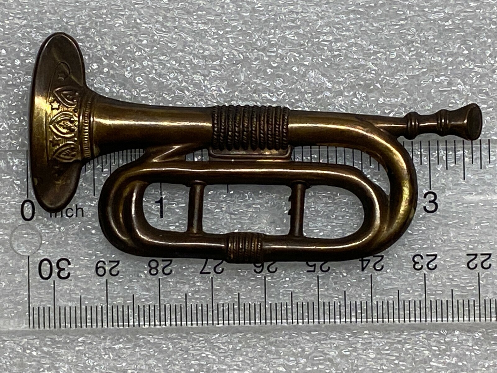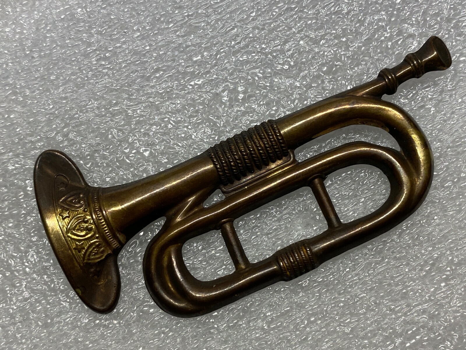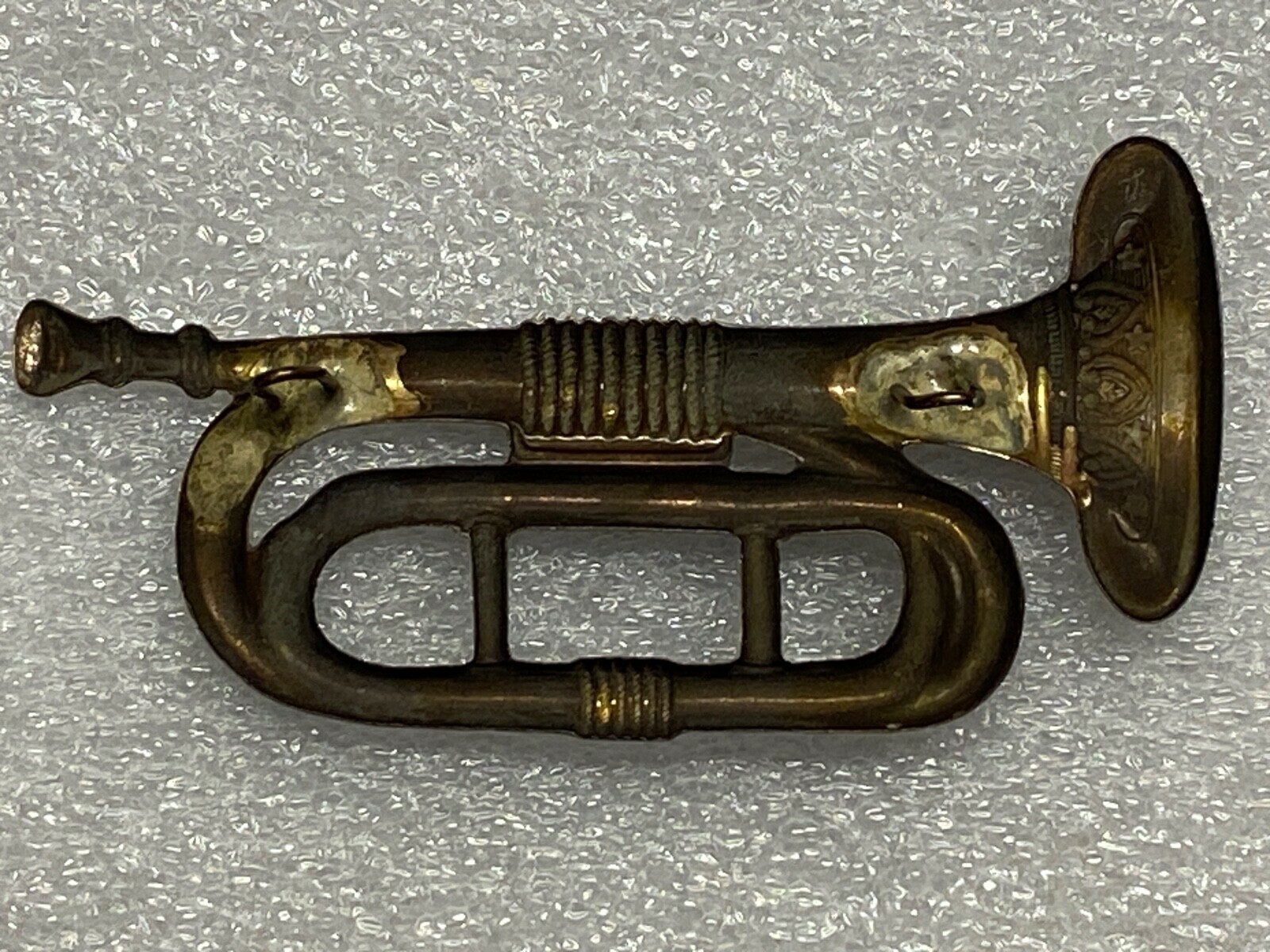 The trumpet was issued by the Army to enlisted men in 1858. Mounts vertically on the cap as shown.