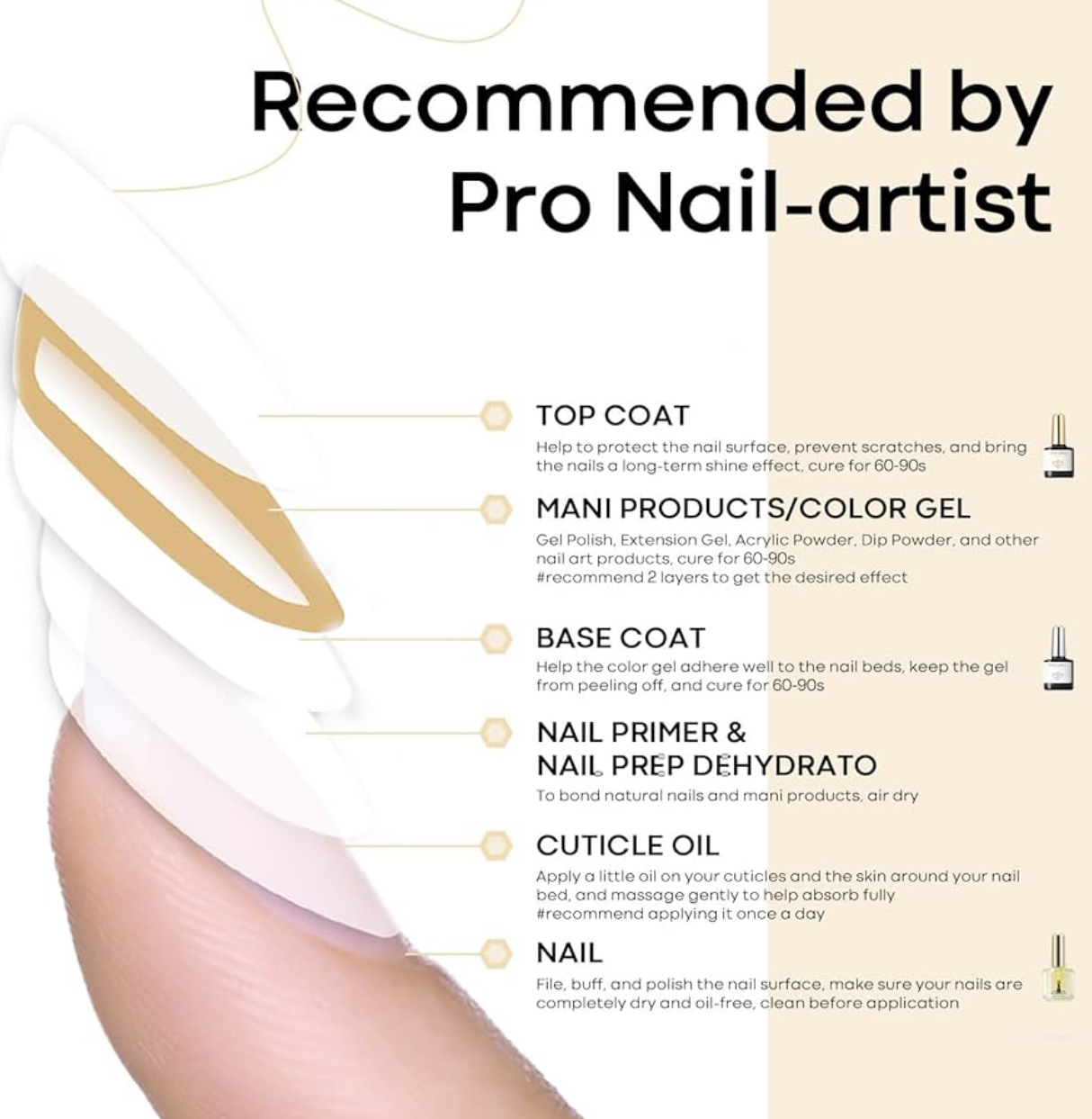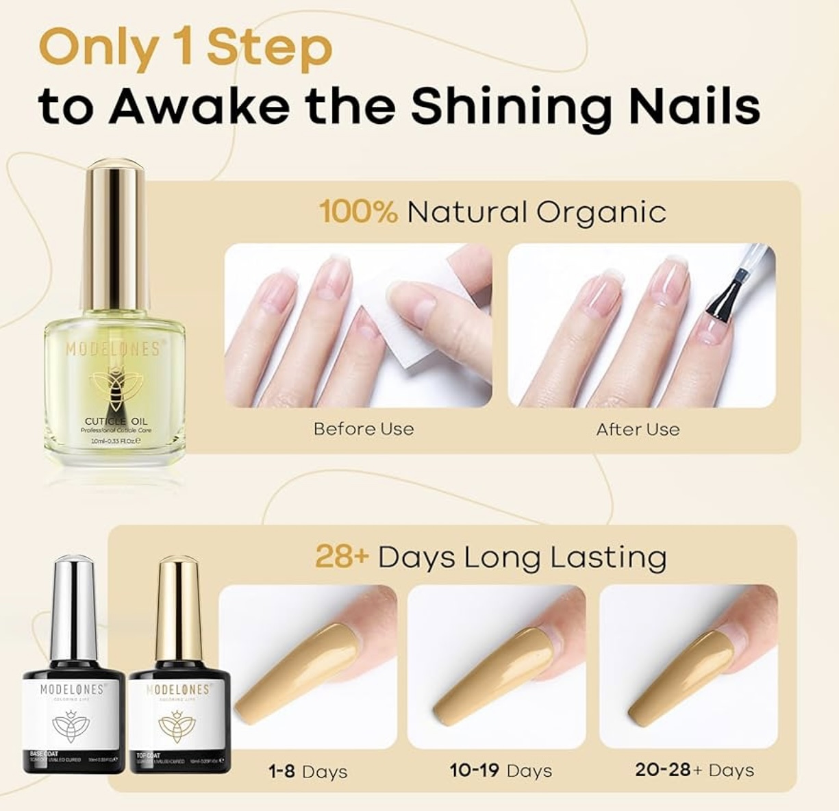 STRONG EFFECT: The CUTICLE OIL can nourish dry, cracked, and fragile cuticles. The BASE COAT helps to bond the natural nails and gel polish, and the TOP COAT brings a diamond shine to nails. They will make manicure products long-lasting for 30+ days when used together