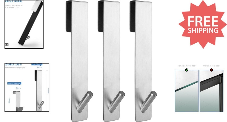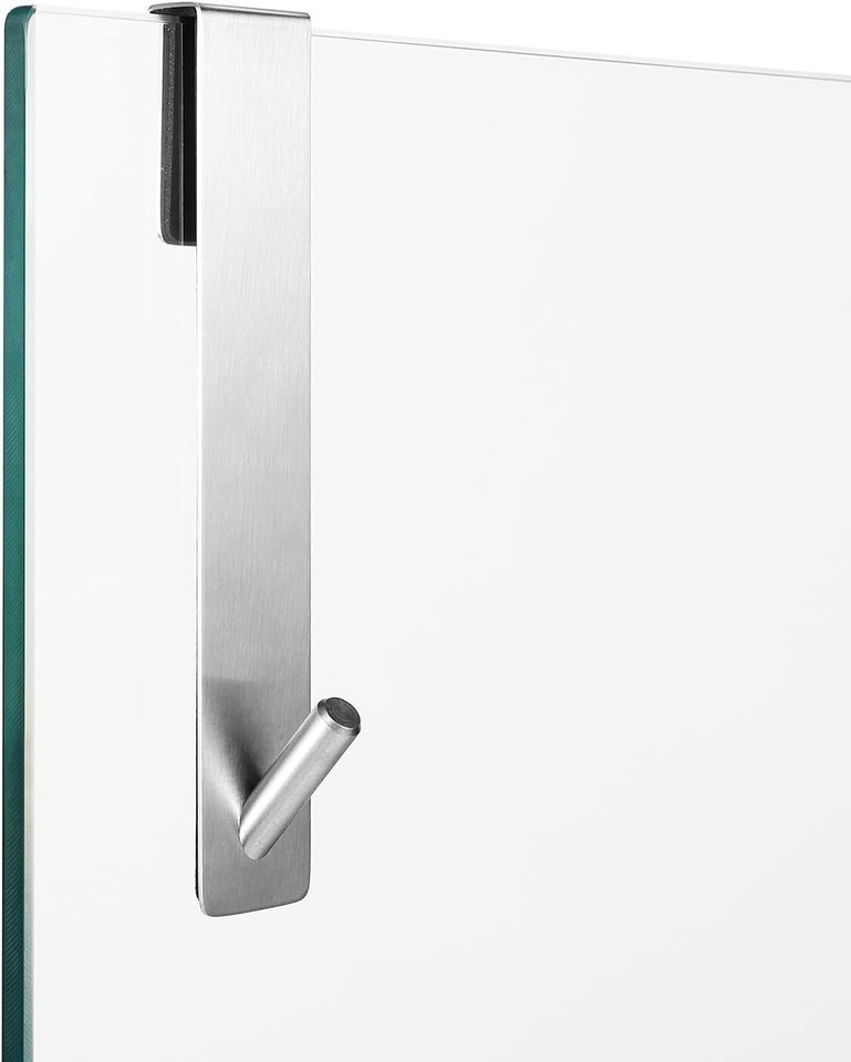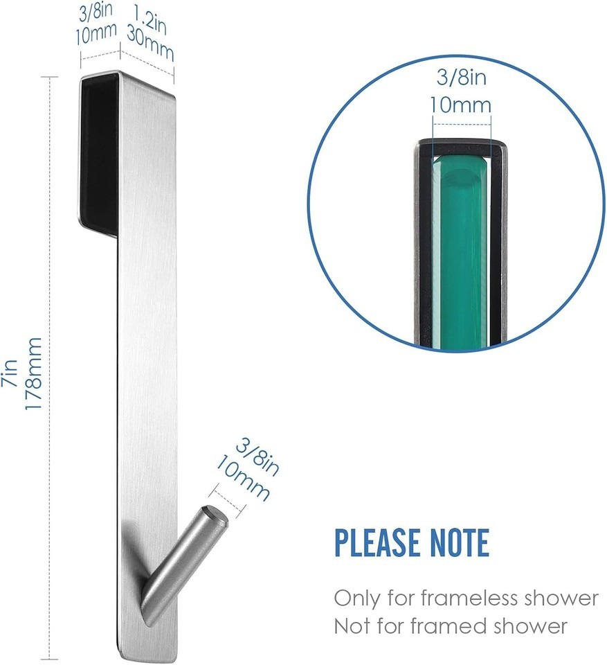 Discover the Simtive Extended Shower Door Hooks, specially designed for frameless glass shower doors up to 3/8" (10mm) thick. These versatile hooks are easy to install?simply attach them to your shower door without drilling or adhesive, saving space and time. Crafted from durable brushed 430 stainless steel, they resist rust and corrosion, and feature a protective sponge pad to prevent scratches on your glass. With an extended length of 7 inches, they provide added convenience, especially for shorter users, making your shower experience more comfortable. Perfect for hanging towels, bathrobes, or loofahs, these stable and stylish hooks combine functionality with ease of use.