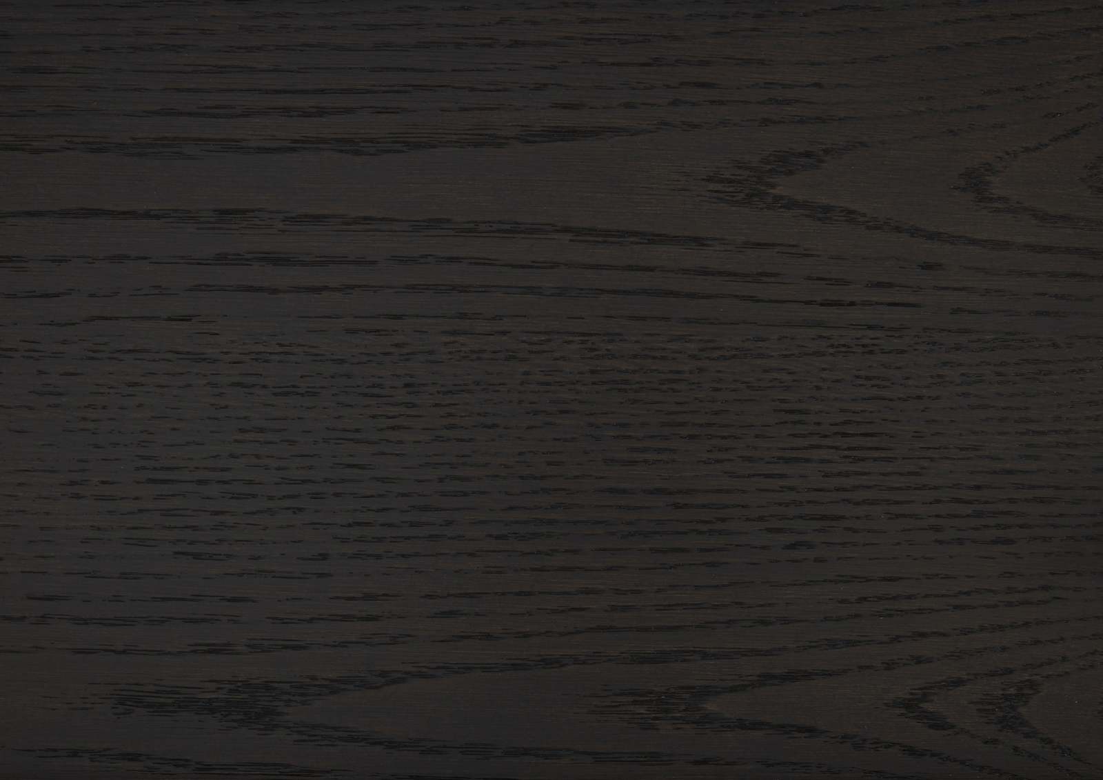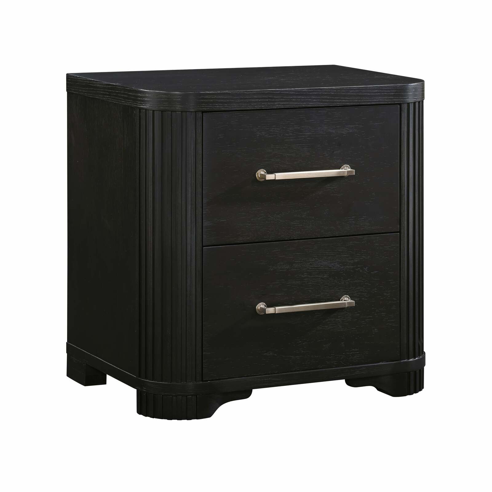 Elegant modern styling comprises the design of the Gilbert Collection while drawing subtle inspiration from the Art Deco movement. The oak veneer of the collection features a charcoal finish providing a rich hue to the distinct wood grain. Polished brass-tone bar pulls center each drawer of the nightstand for complementing contrast.