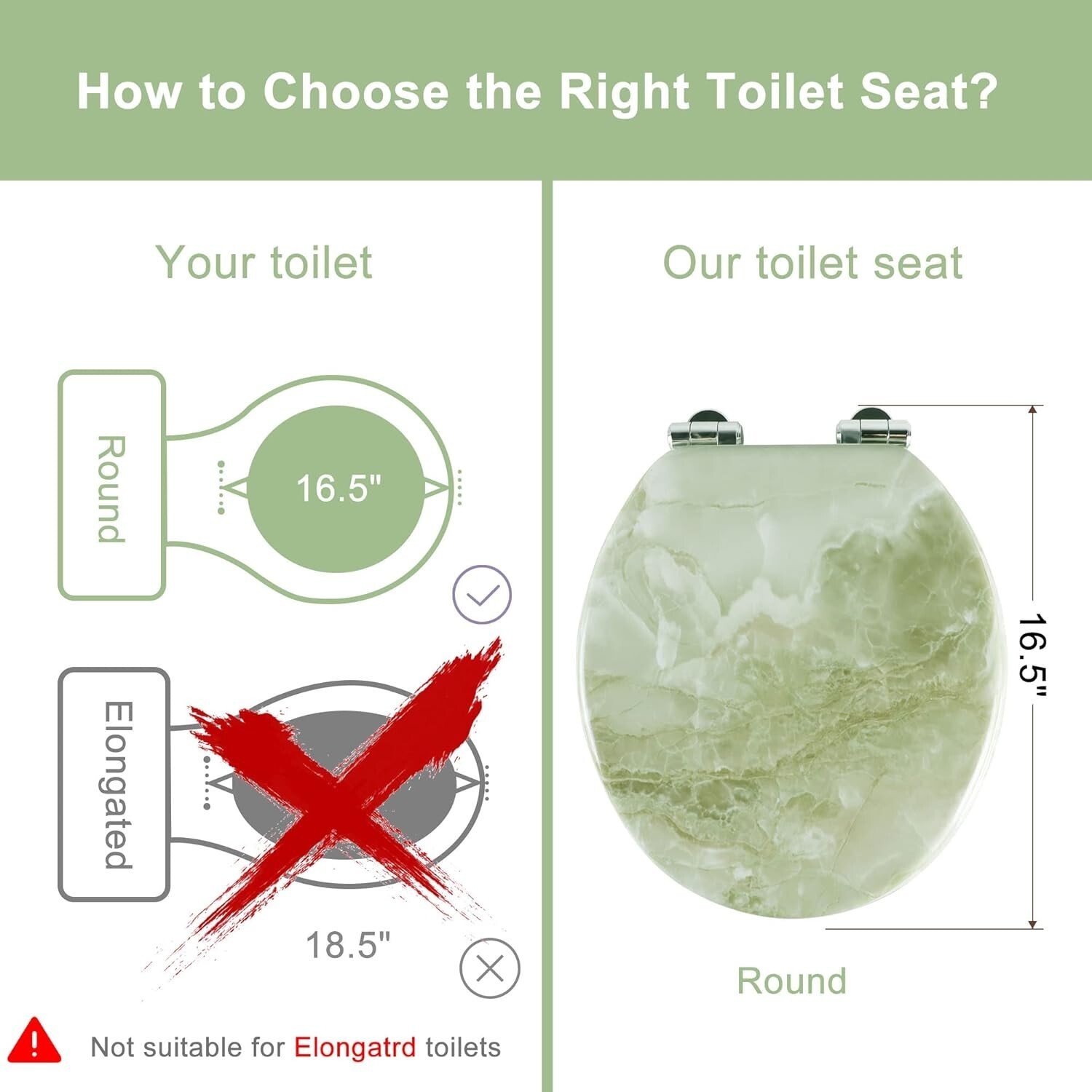 Upgrade your bathroom with our universally fitting, modern toilet seat designed for all American toilet brands including Crane, Universal Rundle, Eljer, Delta, Bemis, Caroma, and Gerber. Crafted from eco-friendly virgin pulp wood with a luxurious marble texture, it combines style with sustainability. Features include quick release hinges for effortless cleaning, slow-close technology to prevent slamming and pinching, and easy installation that takes less than 3 minutes?no professional tools required. Ensure a perfect fit by measuring for the round size, and follow our simple installation tips for optimal use. Elevate your bathroom experience with quality, convenience, and eco-conscious design.