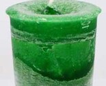The votive candle measures approximately 2 inches (5.08cm) tall, has been colored green, and is scented with the scents of nutmeg, clove, citronella, cinnamon, rain, and myrrh.