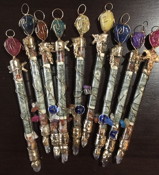 Featuring gemstones on either end with symbols of wealth in its clear shaft, this is a powerful aid in channeling energy for money spells during your spellcrafting. Various metal decorations adorn the outer length of the shaft.