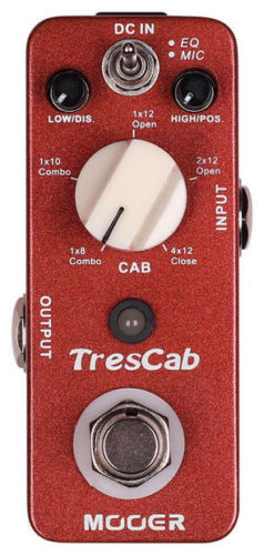 The Mooer TresCab is a high-quality digital speaker/guitar cabinet simulator effect pedal for electric guitar. 5 different guitar cab models to choose from. There is a low/dis. control adjusts the bass in the EQ mode, high/item control adjusts the treble in the EQ mode.
