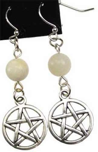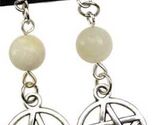 Made to function as miniature prayer beads, these earrings will allow you to focus your energy with your daily meditations. Hypo allergenic, surgical steel French hooks. Gemstone is a Moonstone, pewter pentagram, and surgical steel french hooks. Beads are about .25 inches in diameter, and charms are about .5 inches. Overall length is 2.25 inches. Made in the US.