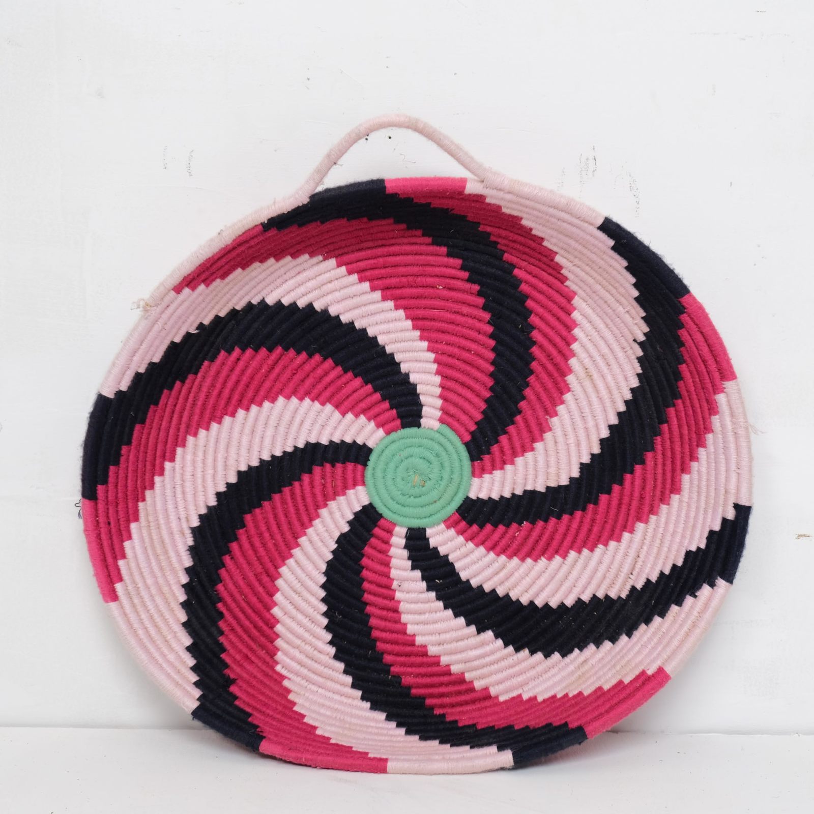 Product description: Transform your space with this stunning 42cm Moroccan wall basket featuring a dynamic swirled pattern in rich brown, black, pink, rose, and pastel green tones. Each basket is meticulously handwoven by skilled artisans, creating a one-of-a-kind decorative piece that celebrates authentic North African design heritage. The versatile 42cm diameter makes it perfect as a statement wall hanging, tabletop centerpiece, fruit basket, or decorative storage tray. The intricate spiral design adds visual interest and texture to any room, while the vibrant color combination complements both modern and bohemian interiors. Light yet sturdy, this multi-purpose basket comes with a built-in loop for easy hanging. Whether displayed alone or as part of a gallery wall, this handcrafted treasure brings global flair and artistic charm to your living space.