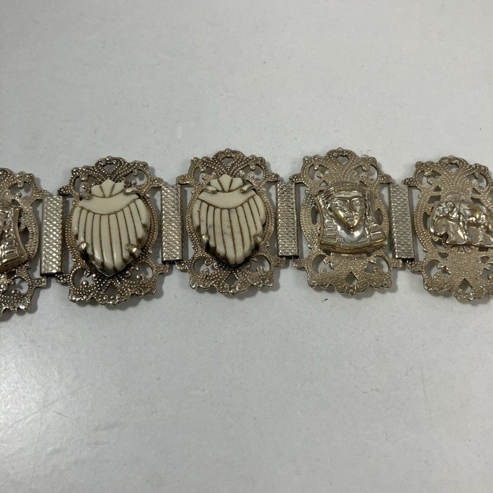 More likely a souvenir and therefore a fashion panel cuff bracelet. Scarabs likely made of resin and not stone or bone. But very eye catching and appealing. Fits a 7-8 inch wrist with the links added. Just a bit over 1 inch wide.