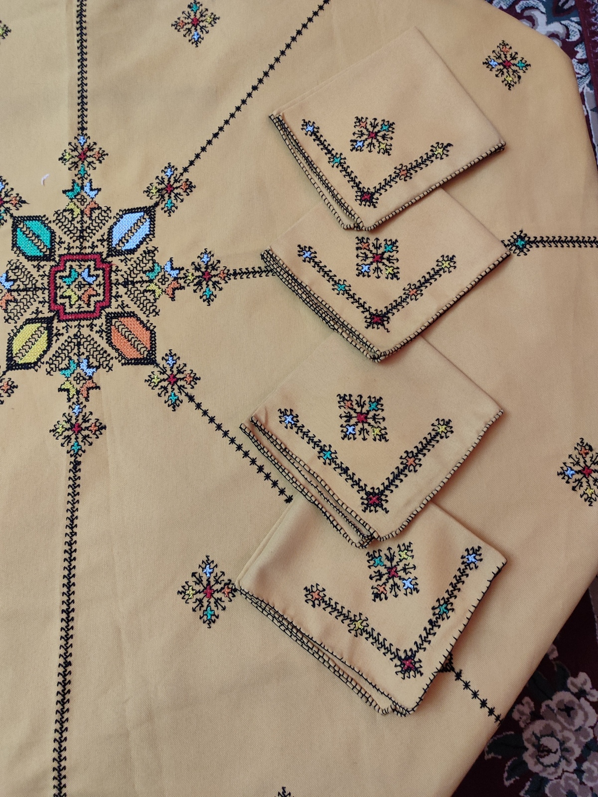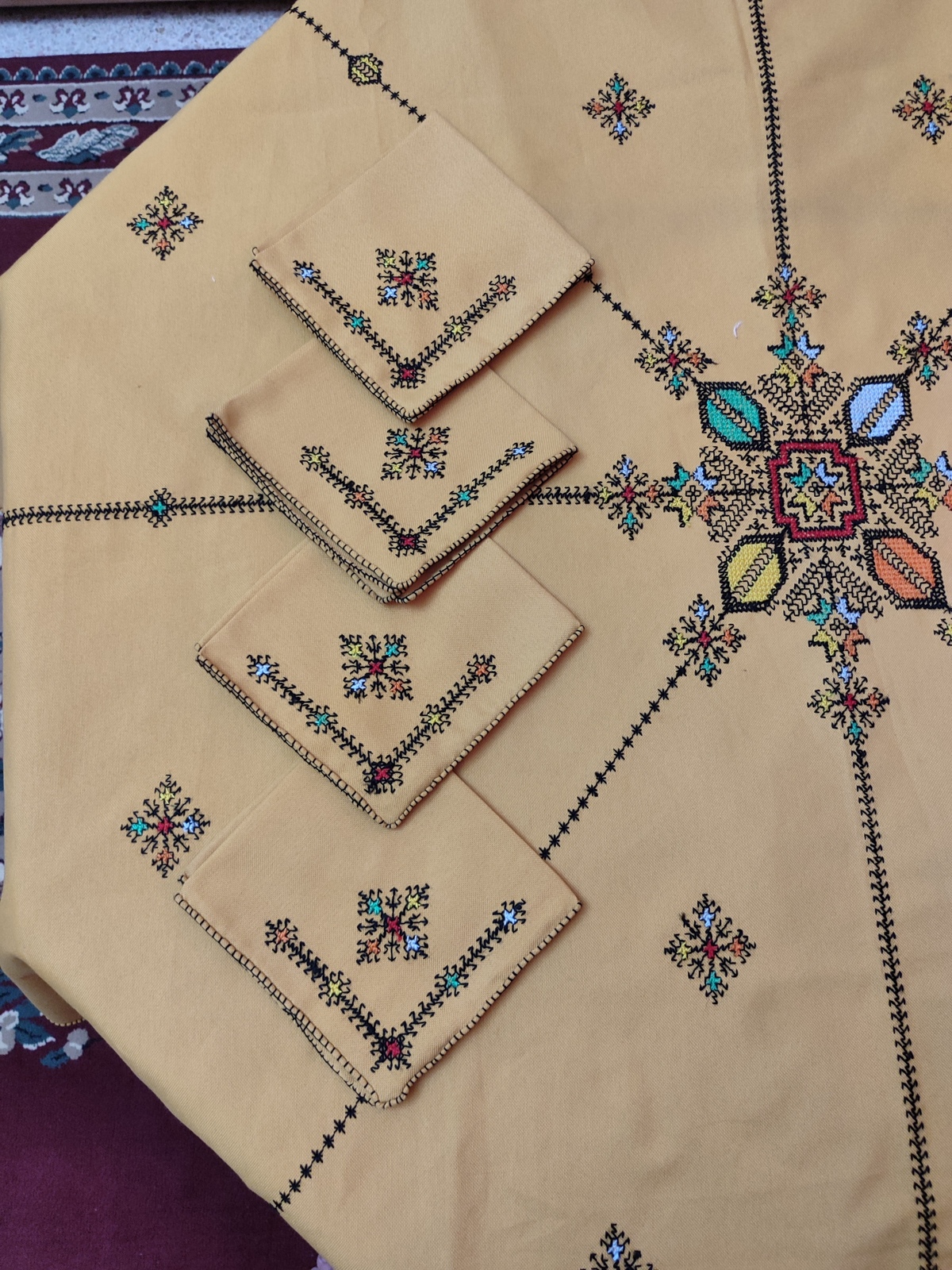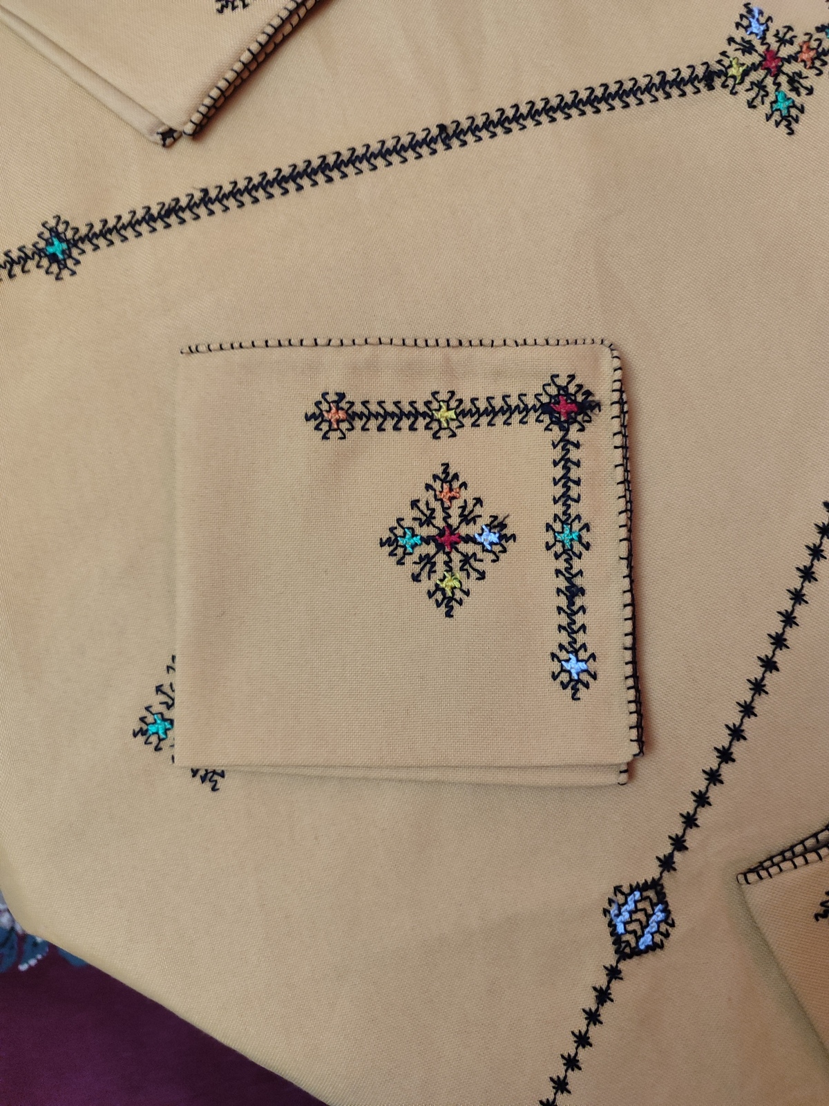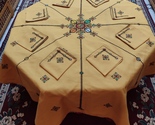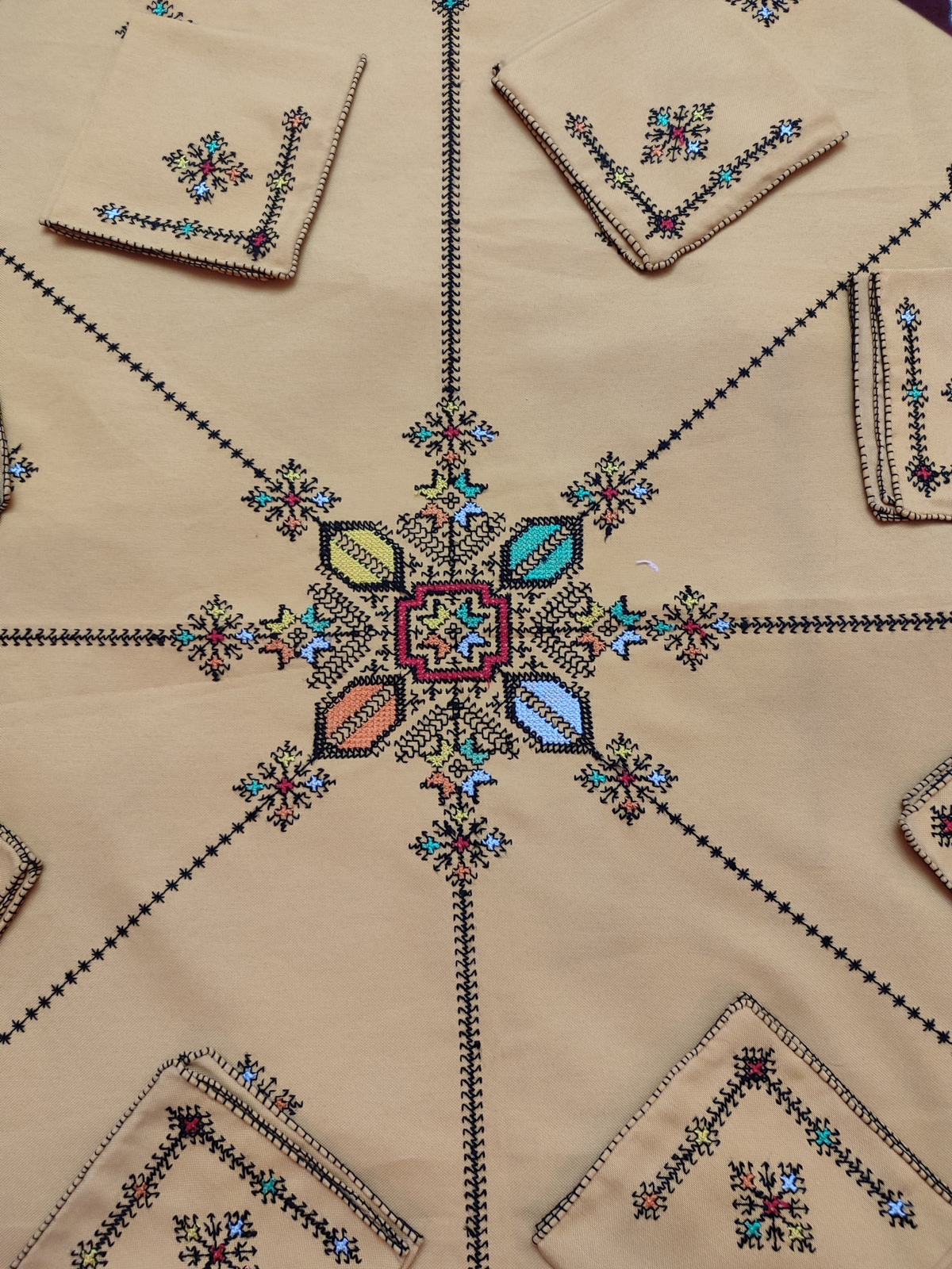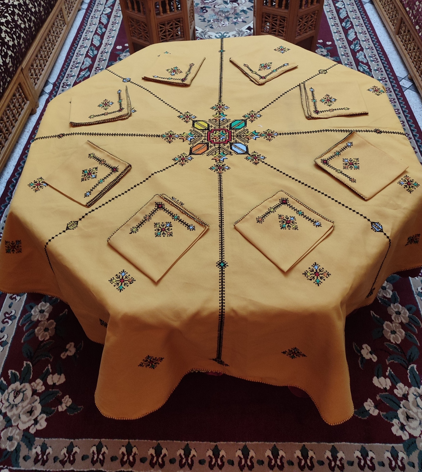 - Moroccan Tablecloth Set in mustard- Embroidered Round Cloth & 12 Napkins