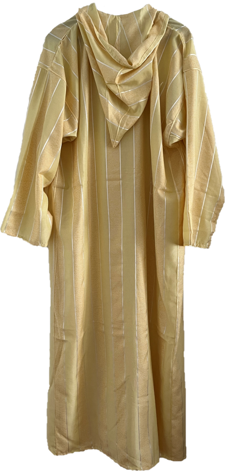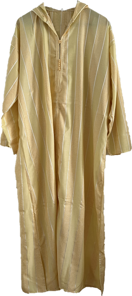 Moroccan Djellaba, a loose-fitting robe. It has a v-shaped opening at the neck which is adorned. It has a quite pointed hood. It has no pockets but does provide openings through which one can reach to get at the pockets of clothes worn underneath. These Moroccan Djellabas are Made in Fez from hand spun and hand-woven natural cotton harvested from local sheep, patterned with vertical stripes and incredibly comfortable. Can be dressed up for a party or worn casually at home.