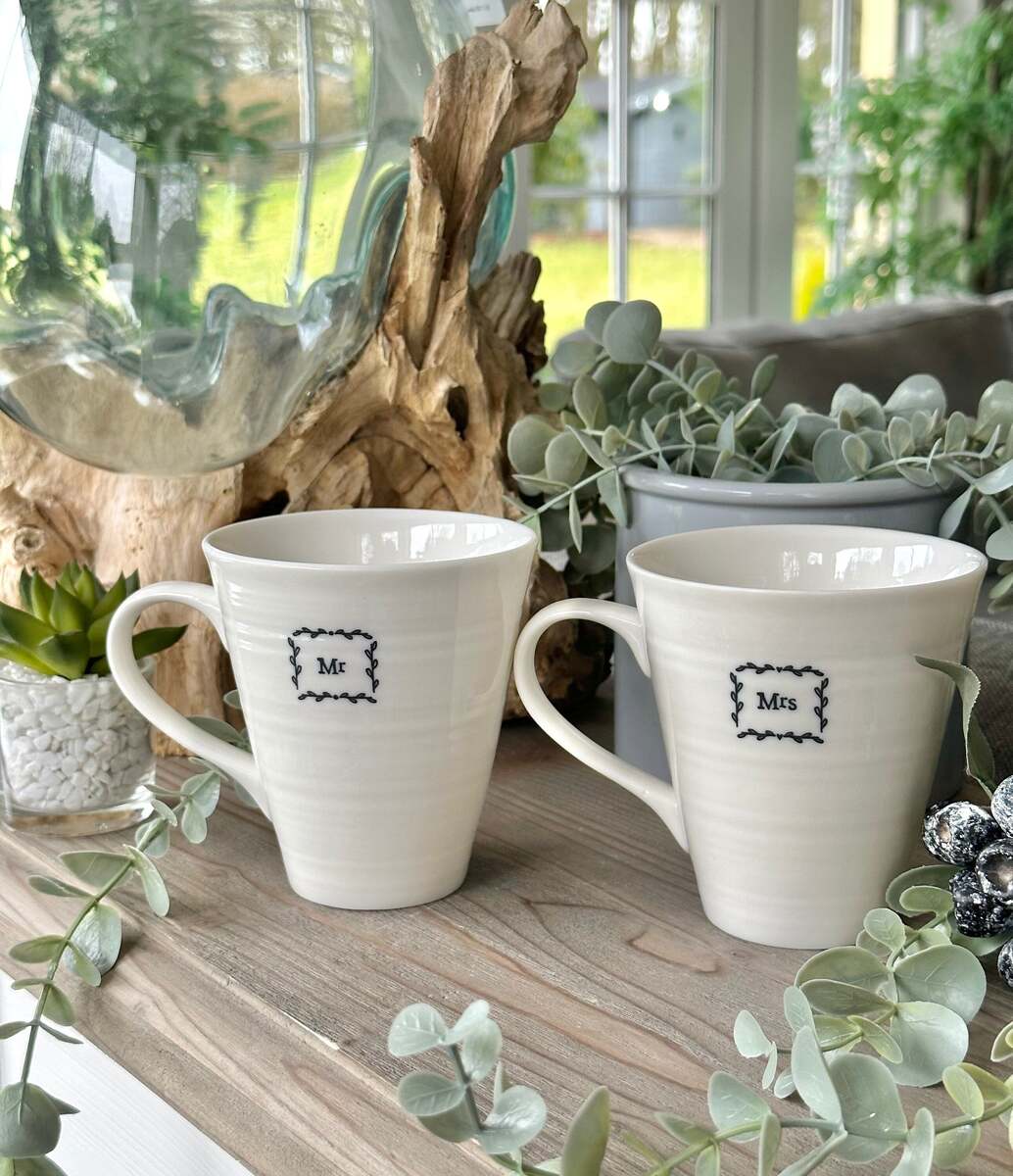 A classic mug design, each featuring a white background with beautiful black typography saying either Mr or Mrs.