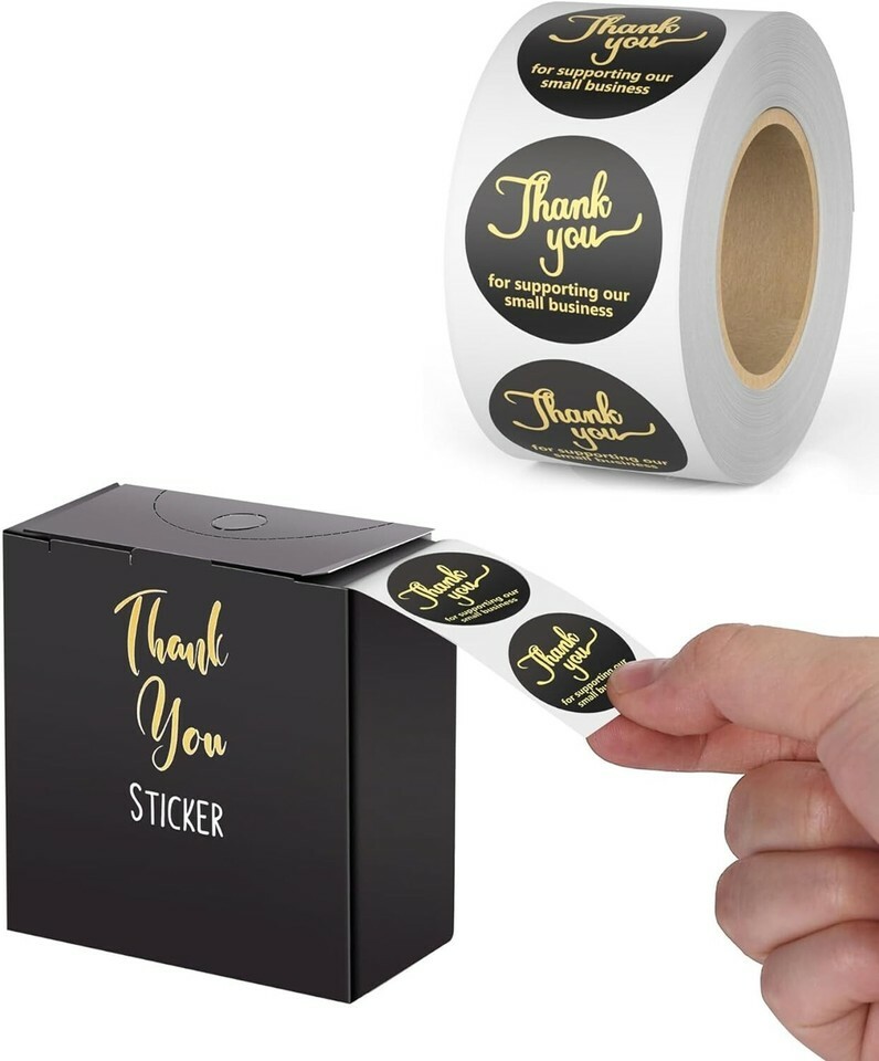 Thank you stickers are 1 inch in black color and printed in eye-catching golden ink and a stylish font.