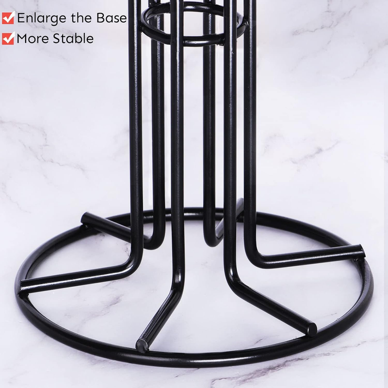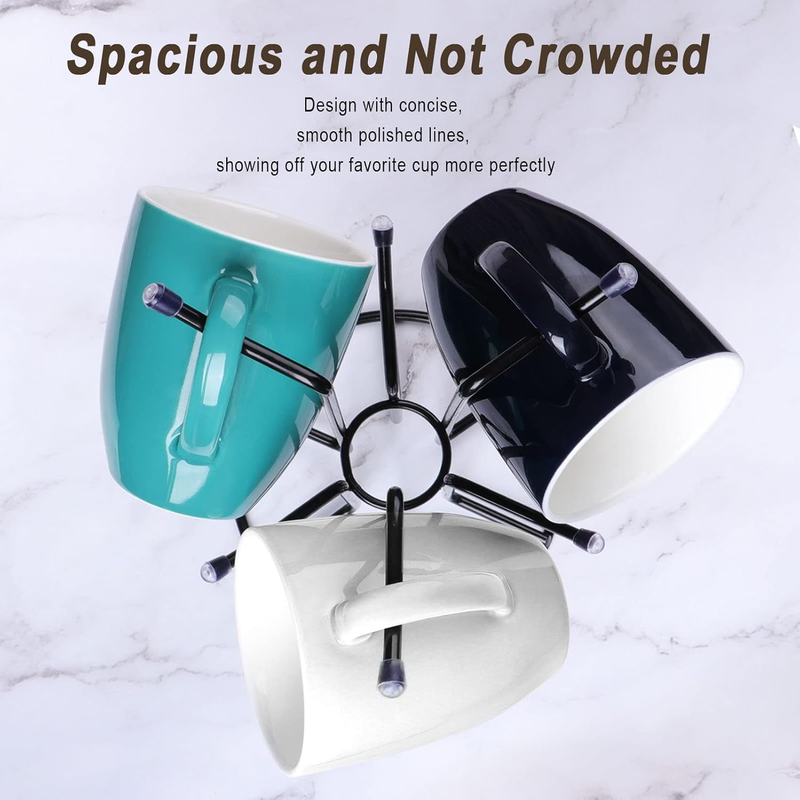 Sturdy and Stable: HULISEN Mug holder bottom diameter is increased to 6.5 inches, even if you put more cups on one side, it will not affect the balance. Sturdy bottom ensures the coffee mug tree stand stably on the counter. Hook adopts an upwards arc design to prevent the cup from falling, each center rod keeps the cup from sliding inward.