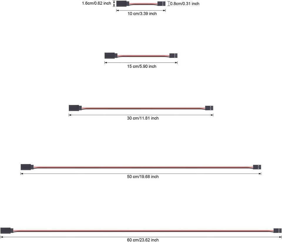 This set includes 30 high-quality female-to-male servo extension cables, available in five different lengths: 10 cm, 15 cm, 30 cm, 50 cm, and 60 cm. Each length features 6 durable connectors with 3-pin Futaba-style connections, designed with an angled feature for easy installation. These versatile cables are ideal for connecting Futaba and JR servos, RC cars, planes, helicopters, and drones. With flexible usage and a comprehensive range of lengths, they meet various project needs with reliable performance.