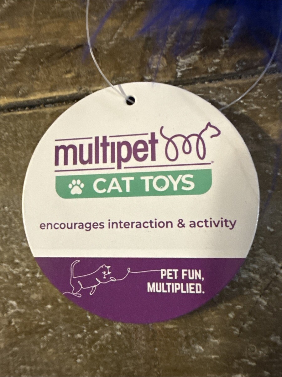 The MultiPet Feather Rattler Cat Toy in Blue is an interactive toy designed for cats to play with. Made by the brand MultiPet, this toy features a bell inside that will catch the cat's attention and entice them to chase and play with it. The bright blue color adds an extra element of fun and excitement for the cat to engage with. This toy is a great way to provide entertainment and playtime for cats, keeping them active and stimulated.