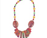 Pre-Owned. You will think of a beautiful sunset when you see this colorful necklace in shades of red, green, purple,yellow, and orange. There are various sizes, shapes, and colors of beads that make up the strand. Two larger oval beads lead into cylinder shaped beads that graduate from short to longer sizes ending in one longer bead. It fastens with a lobster clasp. This is an eye catching necklace for casual or dressy occasions.