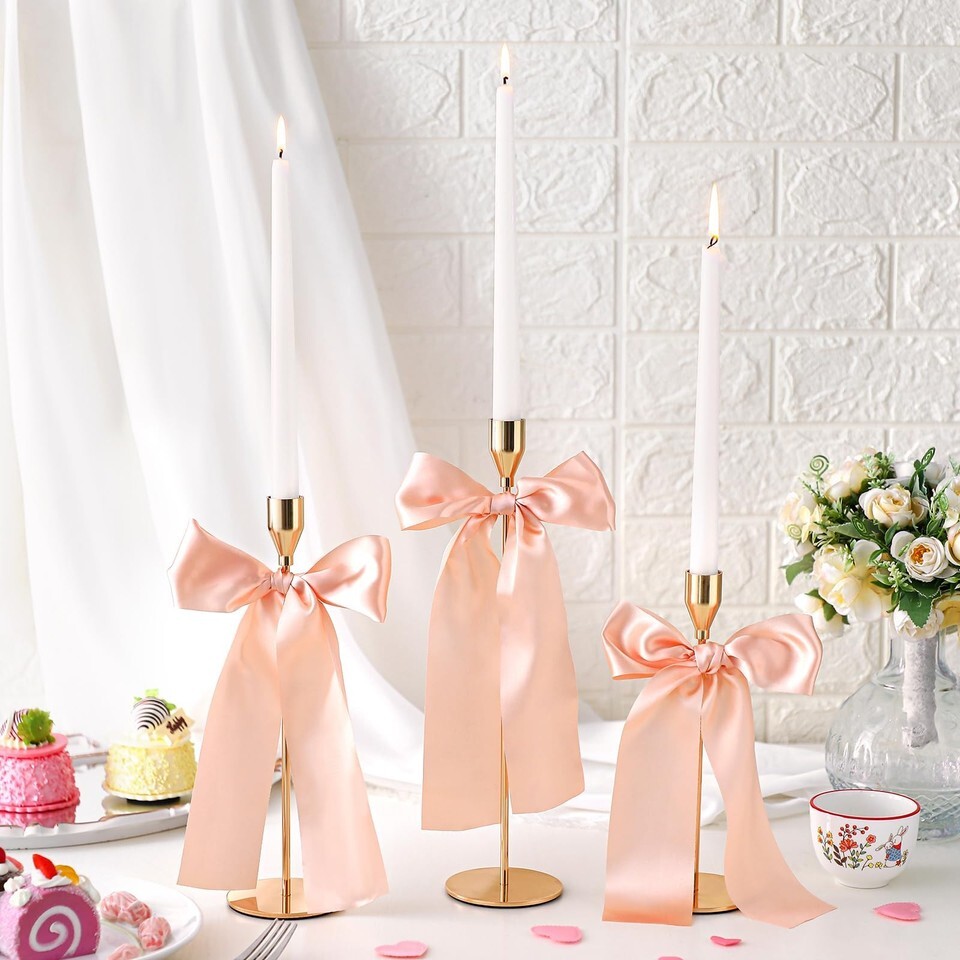 - Mumufy 6 Set Gold Metal Taper Candlestick Holders Pink Satin Bow