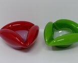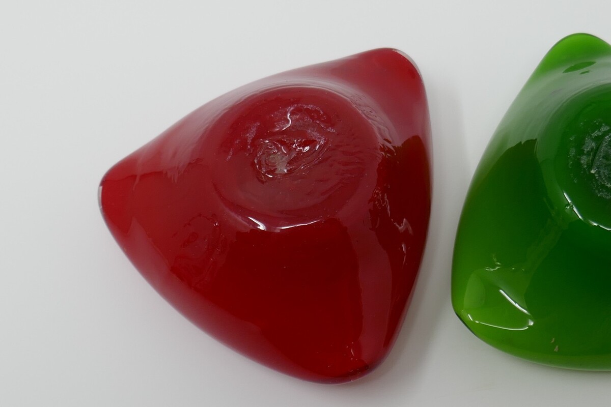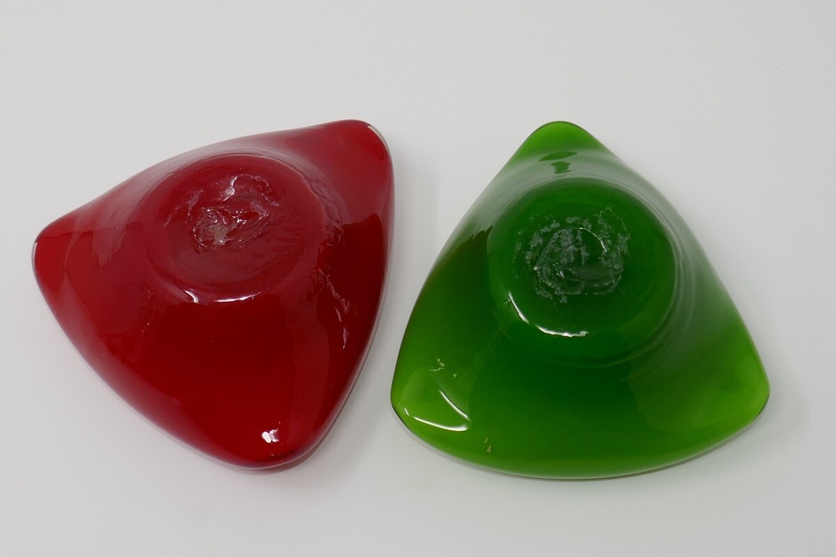 These Murano style art glass triangle shape dishes are a vintage piece from the mid-20th century measuring approx. 4.25" long on each side. The green and red glass colors create a bold and eye-catching design, typical of the Art Deco style. Perfect for adding a touch of vintage flair to any room decor, these original art glass pieces are a one-of-a-kind addition to any collection.