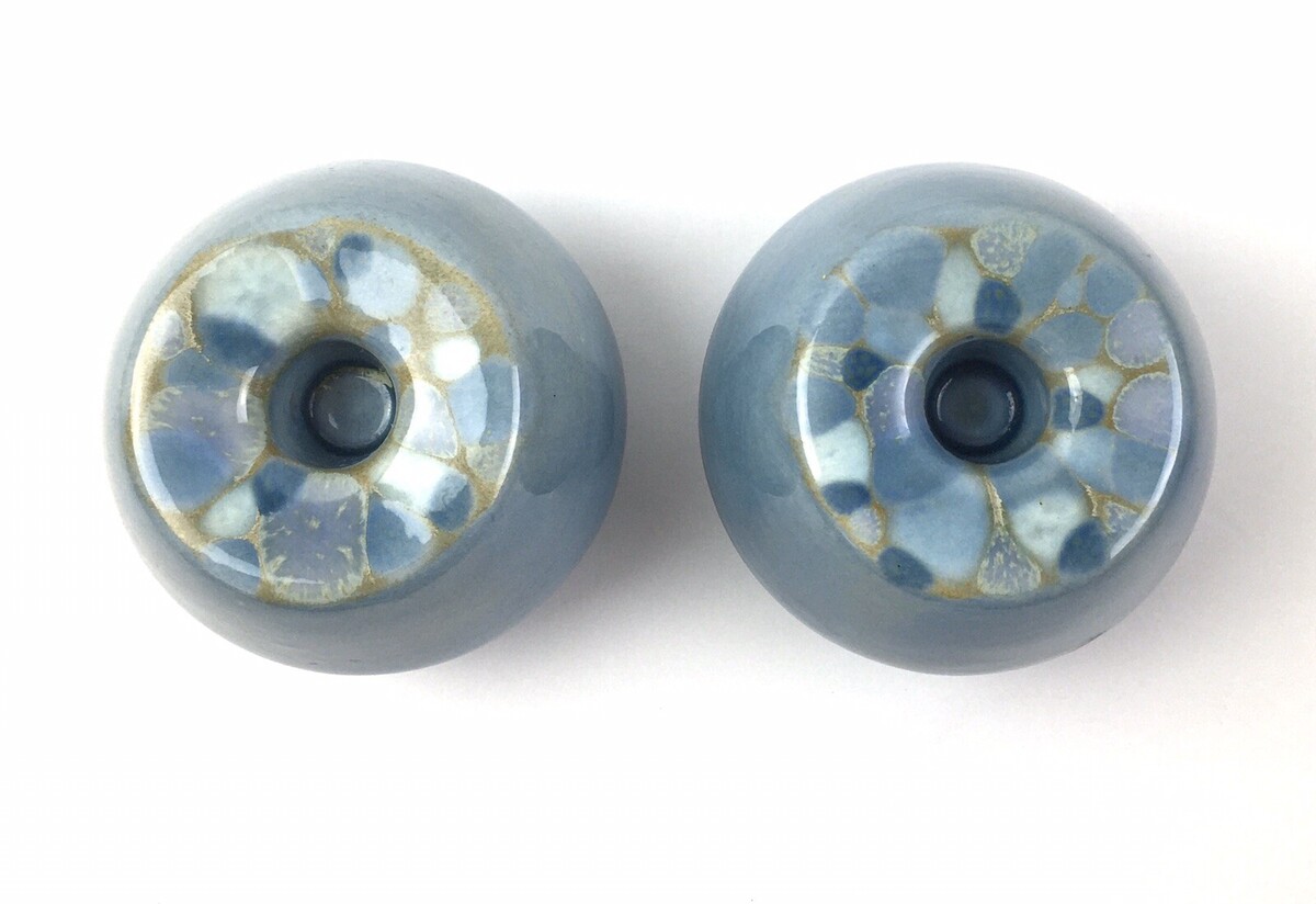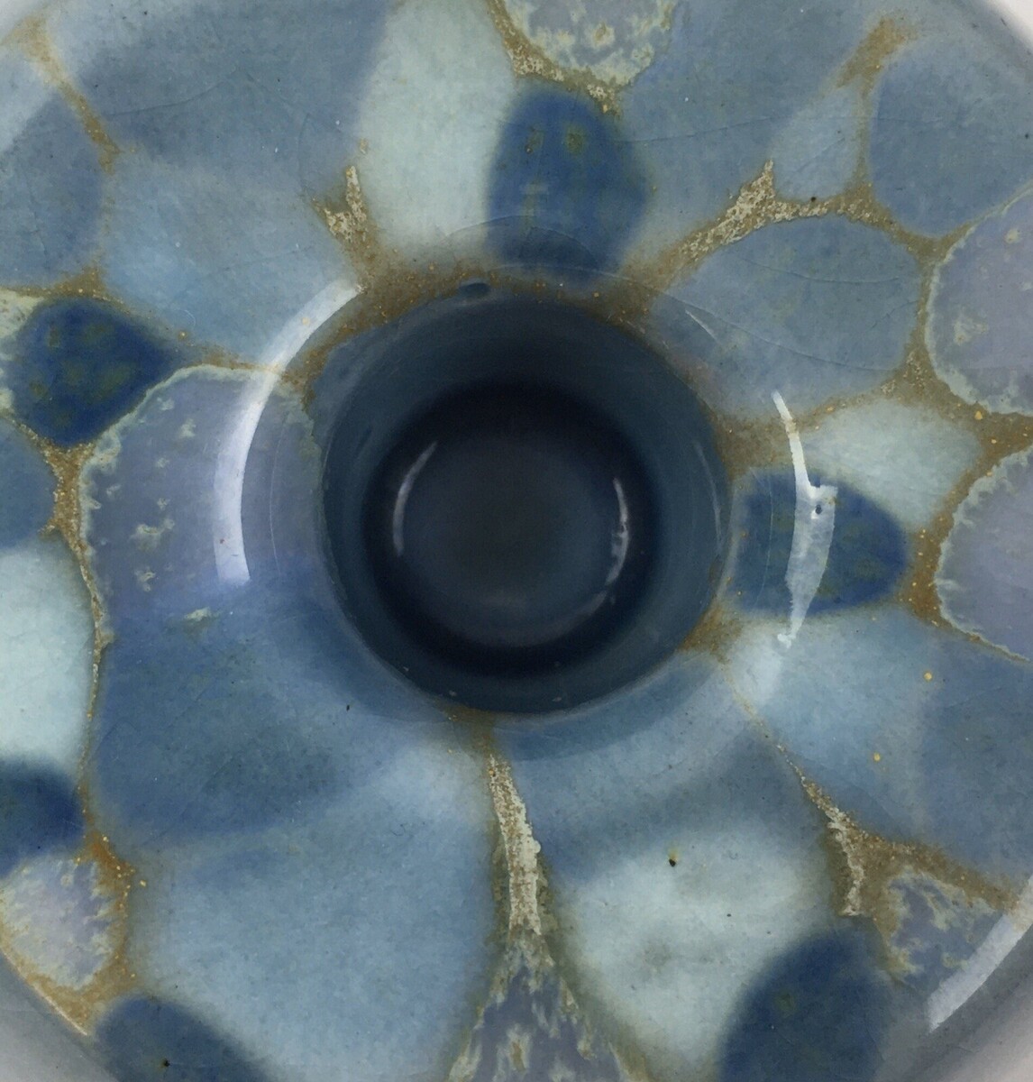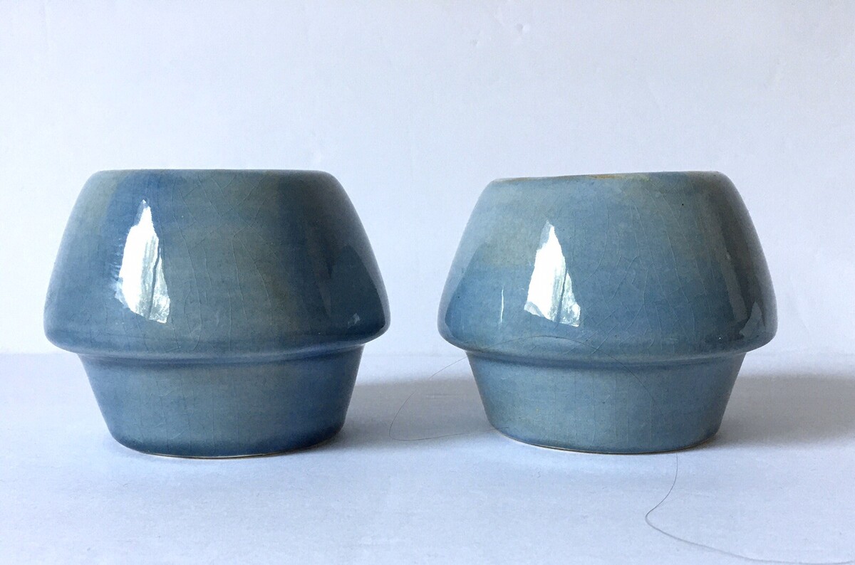 Strong coloring and extensive crazing which may be an intended design element. Nice glaze and coloring, A pin size divot on one. No cracks or chips, but there is a scrape on one where you insert the candle. Measuring 3.75 inches tall, 3.5 in diameter with .75 inch hole for candle.