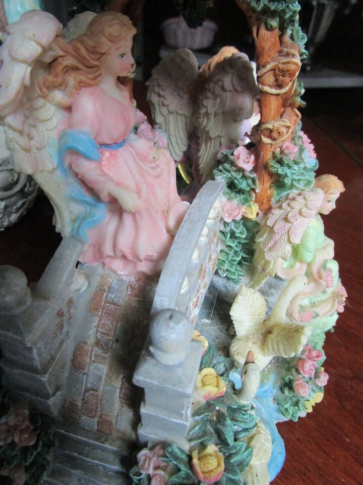 Musical box, plays "Amazing Grace" Angels Sculpture on a bridge with water globe and flowers, beautiful sculpture, it seems resine or alabaster, sounds very well 9" tall x 10" long by 5" wide
