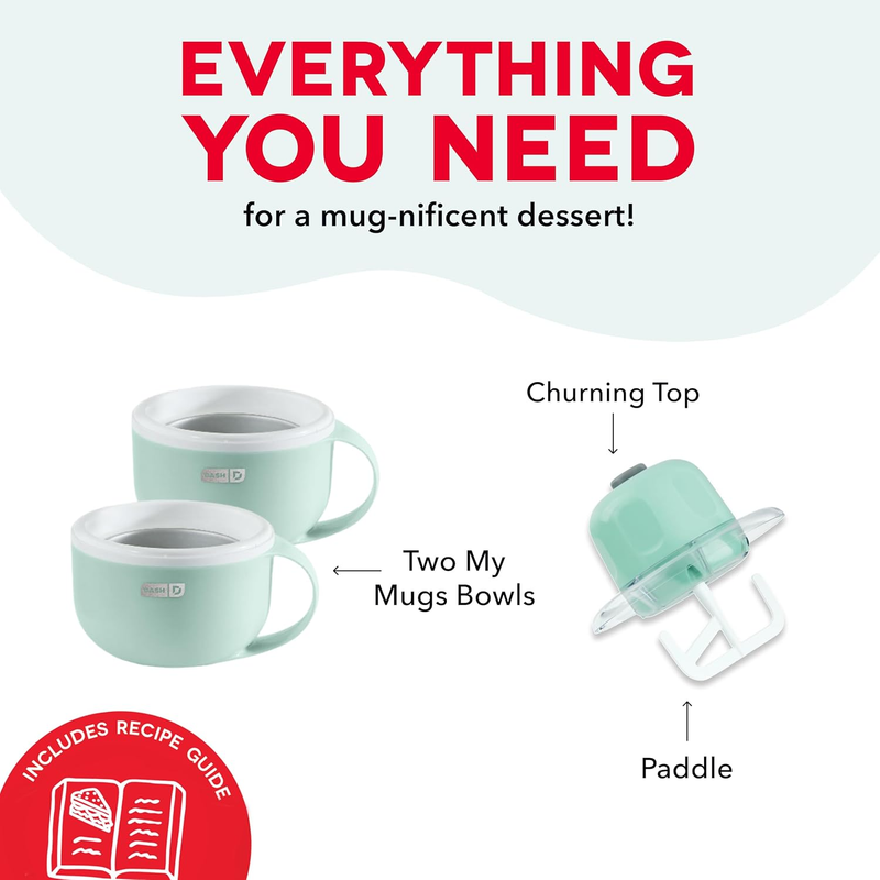 INCLUDES: One DASH My Mug Ice Cream Maker with (2) Bowls, Recipe Guide, and Instruction Manual