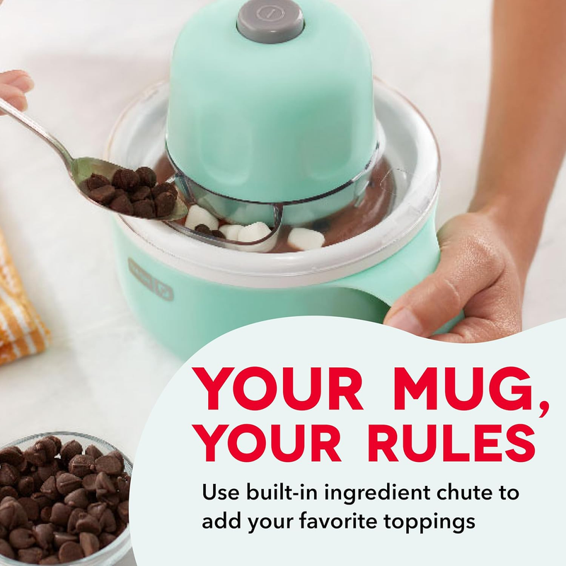 VERSATILE ICE CREAM MACHINE: The DASH My Mug Ice Cream Maker creates delicious single servings of ice cream, gelato, sorbet, and frozen yogurt. Freeze the base for 24 hours, add ingredients, and press the on button for a delectable snack in just 20 minutes.