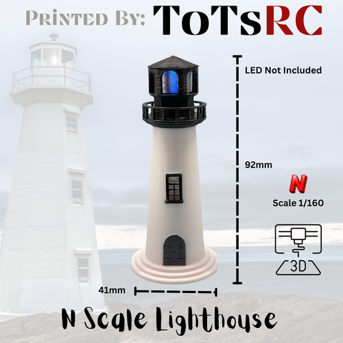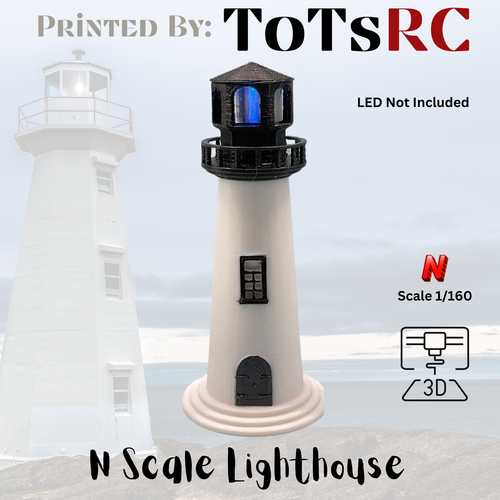 Who doesn't love a light house? I know I do, and so I've searched far and wide to bring one to you. This light house was originally a two peice 3d STL, but not after some revisions and tweaks, 6 actually, we present, the ToTsRC N Scale Lighthouse! What a great addition to your set! Use it by itself or add it to your model railroad. Who doesn?t like to pass by a lighthouse on a scenic ride through the coasts and oceans of the world? Get yours today or gift one Made here in the USA!!