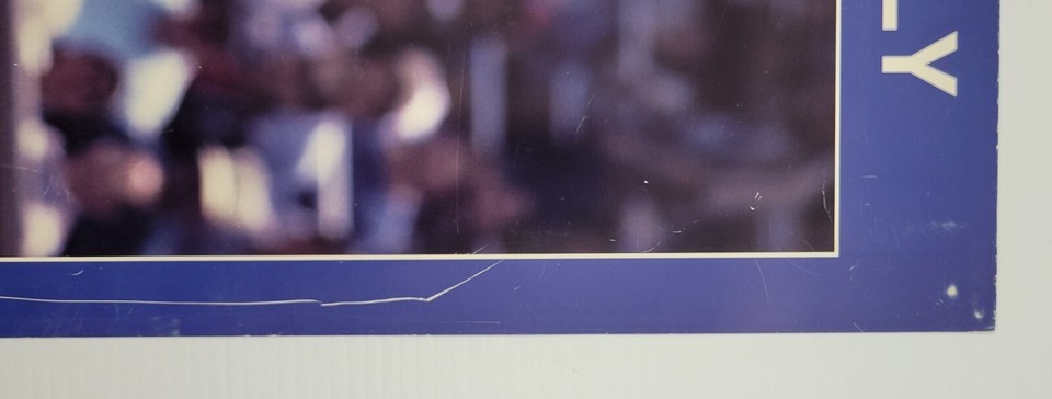Poster has signs of age and years of storage including scuffs, scratches and marks to the finish, specifically down the right side of the poster. Poster has never been tacked, taped or rolled but has some adhesive residue on the back. Semi-rigid poster will be shipped flat.